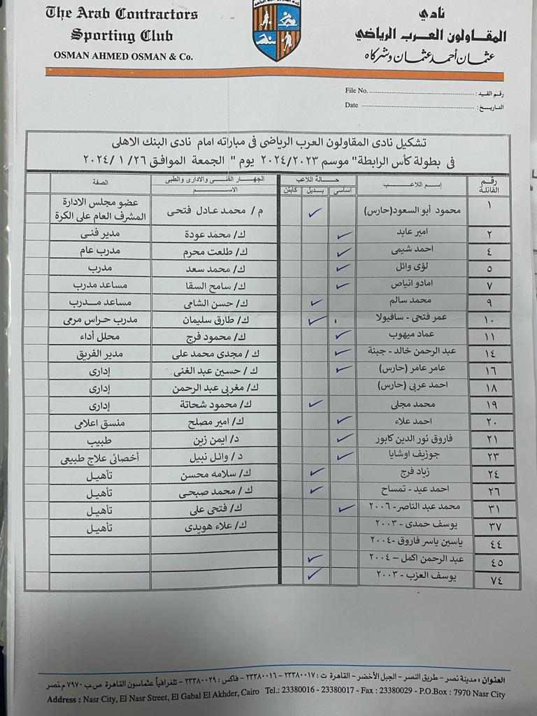 جاء تشكيل المقاولون العرب لمباراة البنك الأهلي: