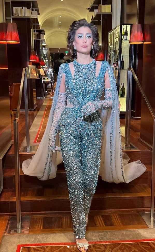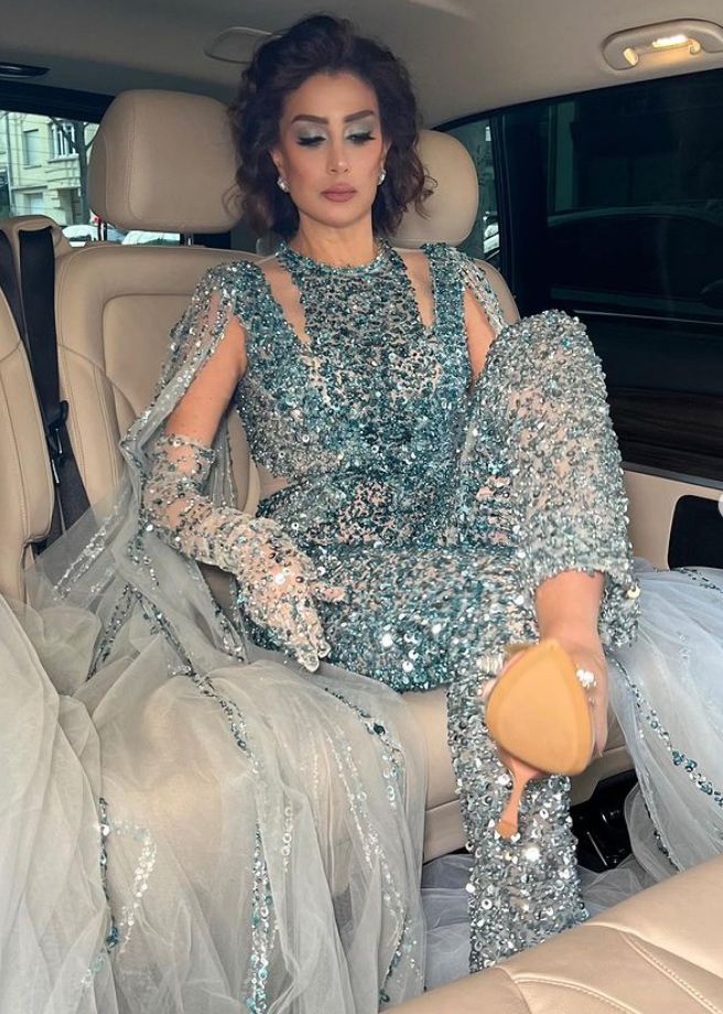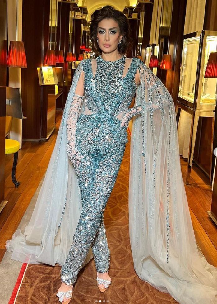 وتألقت غادة عبدالرازق بإطلالة ساحرة، عكست قوامها الممشوق ووزنها المثالي، حيث ارتدت جمبسوت لافت، طويل مجسم، بأكمام مزينة بالجوانتي، صمم من التل المطرز بالكامل بحبات الترتر بلون الجنزاري، الجمبسوت حمل توقيع مصمم الأزياء اللبناني زياد نكد، لتؤكد للجميع انها تملك قوام طويل رشيق كعارضات الأزياء، فيما انتعلت حذاء سندريلا الشهير لتبدو مثل أميرات ديزني.