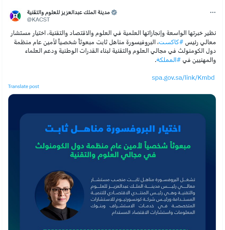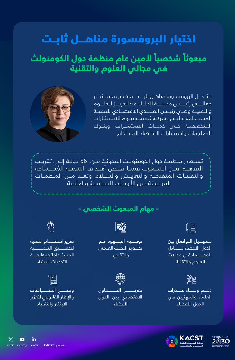 وأعلنت مدينة الملك عبدالعزيز للعلوم والتقنية عبر صفحتها الرسمية بموقع التواصل الاجتماعي "X" تويتر سابقًا، اختيار مستشار رئيس كاكست، البروفيسورة مناهل ثابت مبعوثاً شخصياً لأمين عام منظمة دول الكومنولث في مجالي العلوم والتقنية لبناء القدرات الوطنية ودعم العلماء والمهنيين في المملكة، وذلك نظير خبرتها الواسعة وإنجازاتها العلمية في العلوم والاقتصاد والتقنية.