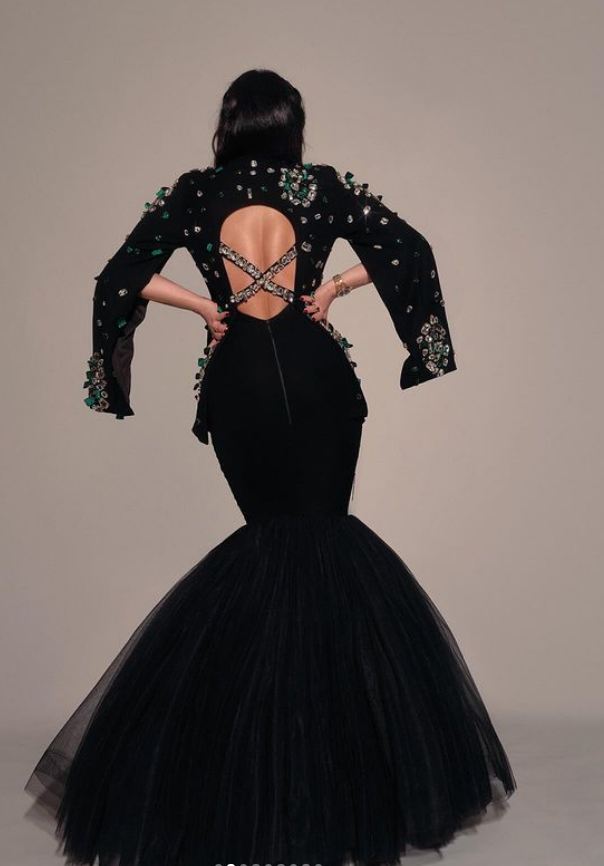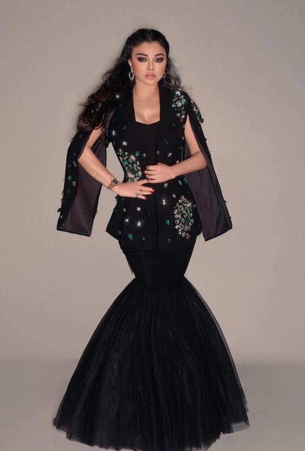 وتألقت هيفاء وهبي بإطلالة ساحرة، تشبه كثيرًا أستايل النجمة الراحلة هند رستم، بإطلالتها الشهيرة بقصة ذيل السمكة، حيث ارتدت فستانا مجسما، ينتمي لقصة ميريد، اتسم الفستان بظهر مكشوف وصمم من قماش التل باللون الأسود وزين بحبات الكريستال.