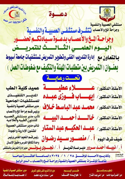 ينظم مستشفى الأمراض العصبية والنفسية وجراحة المخ والأعصاب بالتعاون مع إدارة التدريب الفني وتطوير التمريض بالمستشفيات الجامعية ورشة عمل حول التمريض بين متطلبات المهنة والتكيف مع ضغوطات العمل، يوم الأحد القادم 28 يناير في تمام الساعة 10 صباحا، بقاعة المؤتمرات بالمستشفى، تحت رعاية الدكتور أحمد المنشاوي رئيس الجامعة، والدكتور علاء عطية عميد كلية الطب ورئيس مجلس إدارة المستشفيات الجامعية، والدكتور إيهاب فوزي المدير التنفيذي للمستشفيات الجامعية، والدكتور محمد عبد الباسط خلاف مدير المستشفى، وتحت إشراف الدكتور خالد البيه رئيس قسم الأمراض العصبية والنفسية ونائب مدير المستشفى للشئون الطبية والعلاجية، والدكتور عبد الحكيم عبد الستار نائب مدير المستشفى للشئون الإدارية والجودة، والأستاذة نبيلة أحمد مدير عام التمريض، والأستاذة نجوى يونس مدير إدارة التمريض بالمستشفى.