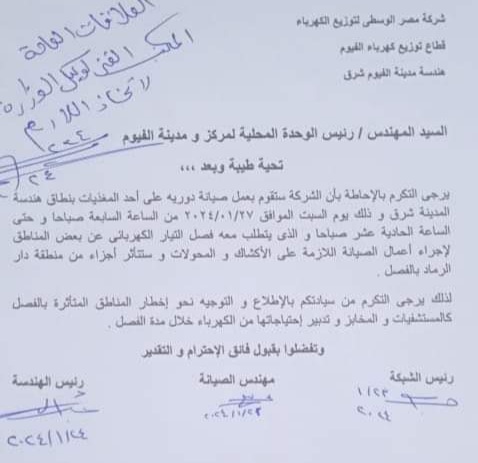 وأكد رئيس الهندسة انه تم مخاطبة المحاسب مراد مسعود رئيس الوحدة المحلية لمركز ومدينة الفيوم وأحياء المدينة والوحدات المحلية القروية التي يشملها فصل التيار الكهربائي، وذلك للاطلاع والتوجيه نحو إخطار المناطق المتأثرة بفصل التيار الكهربائي، والتنبيه على المواطنين والمؤسسات الحكومية والمخابز والمستشفيات، لاتخاذ التدابير اللازمة وتدبير احتياجاتها أثناء فترة الصيانة وحتى يتم الانتهاء من أعمال الصيانة وعودة التيار الكهربائي.