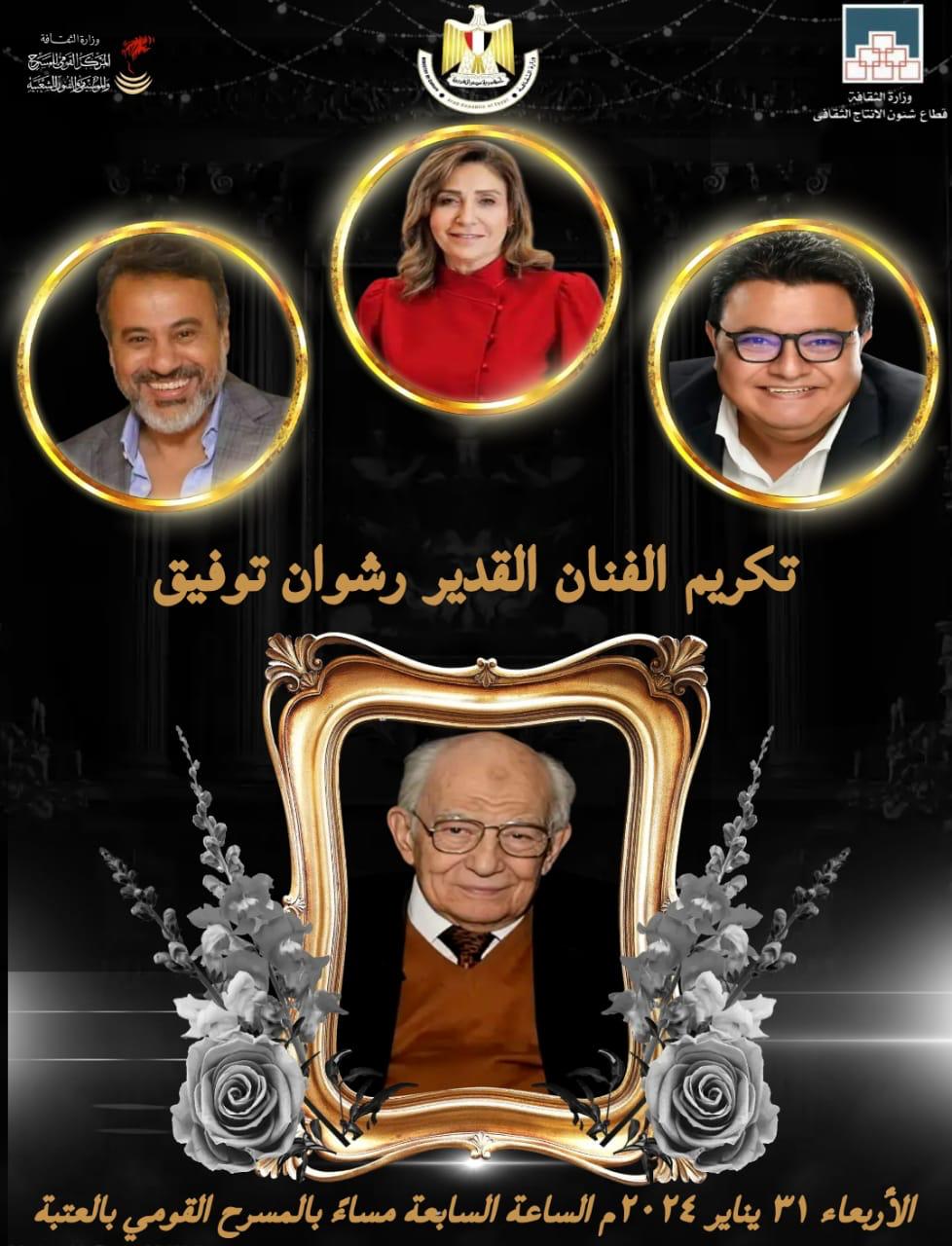 يقيم المركز القومي للمسرح والموسيقى والفنون الشعبية، برئاسة الفنان إيهاب فهمي؛ احتفالية كبرى لتكريم الفنان القدير رشوان توفيق؛ على مشوراه الفني، وعطائه الفني المستمر، تحت رعاية وزيرة الثقافة، الدكتورة نيفين الكيلاني، وإشراف رئيس قطاع شئون الإنتاج الثقافي، المخرج الكبير خالد جلال، وذلك في السابعة مساء الأربعاء المقبل ٣١ يناير بالمسرح القومي.