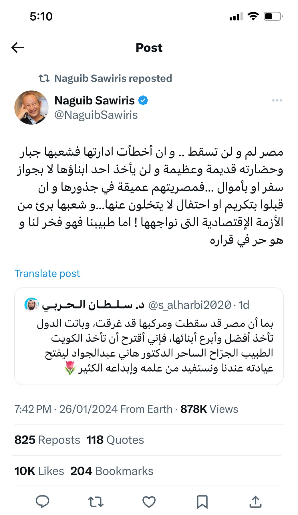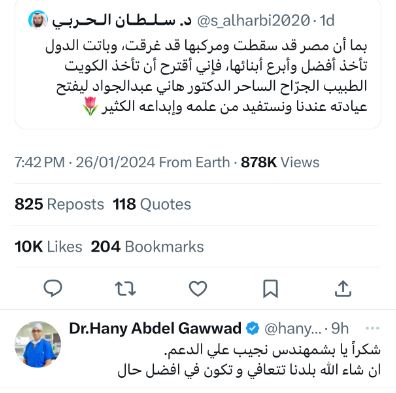 نشر مواطن كويتى تغريدة على مواقع التواصل الاجتماعى "اكس" يهاجم مصر قائلآ : بما أن مصر قد سقطت ومركبها قد غرقت، وباتت الدول تأخذ أفضل وأبرع أبنائها، فإني أقترح أن تأخذ الكويت الطبيب الجراح الساحر الدكتور هاني عبد الجواد ليفتح عيادته عندنا، ونستفيد من علمه وإبداعه الكثير.