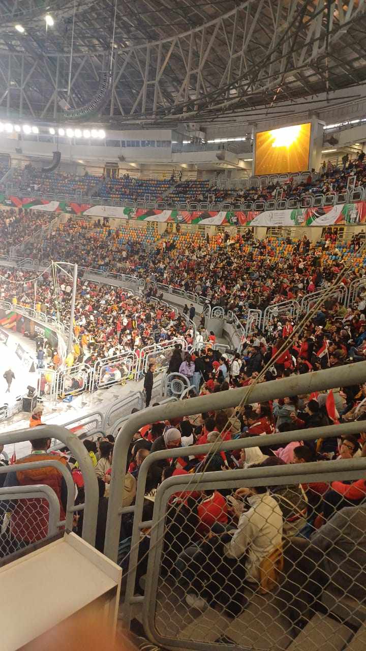 وشهدت الصالة حضور جماهيري قوي دعما للمنتخب المصري في النهائي الأفريقي، من أجل مساندة الفراعنة لحصد البطولة للمرة الثالثة على التوالي.
