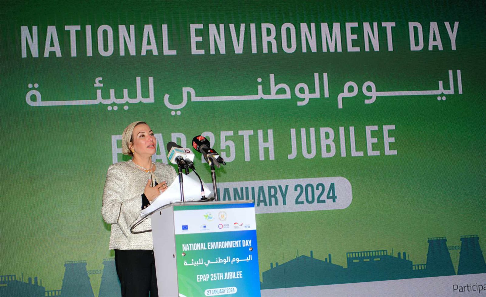 و اشارت فؤاد، في احتفالية يوم البيئة الوطنى تحت شعار مصر في مسارها نحو الأخضر ( الصناعة الخضراء)، التي عقدت اليوم السبت بأحد الفنادق الكبرى بالقاهرة، والذي يتزامن مع الاحتفال بمرور ٢٥ عاما على عمل برنامج التحكم في التلوث الصناعي التابع لوزارة البيئة، الي البرنامج الخاص بالطيور المهاجرة والمدعم من برنامج الأمم المتحدة ، وكذلك دور الاتحاد الأوروبي في اعداد مخطوطات ل ٢٧ محافظة لتنظيم إدارة المخلفات بجانب تنظيم برنامج التحكم في التلوث الصناعي والذي ساعد على تقليل ما يقرب ١٦٠٠ طن من الانبعاثات وكذلك ساهم الاتحاد الأوربي وبنك الاستثمار الأوروبي والوكالة الفرنسية للتنمية الدولية من خلال التحكم في التلوث الصناعي بالتنسيق من خلال وزارة التعاون الدولي في إعادة تدوير ٢٥ مليون متر مكعب من المياه.