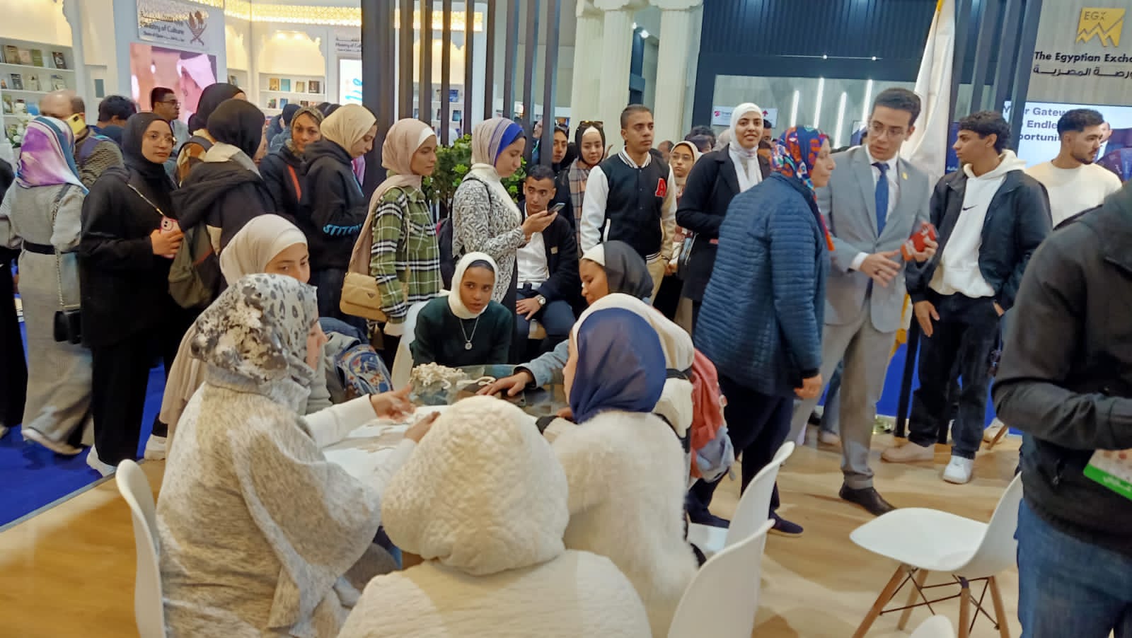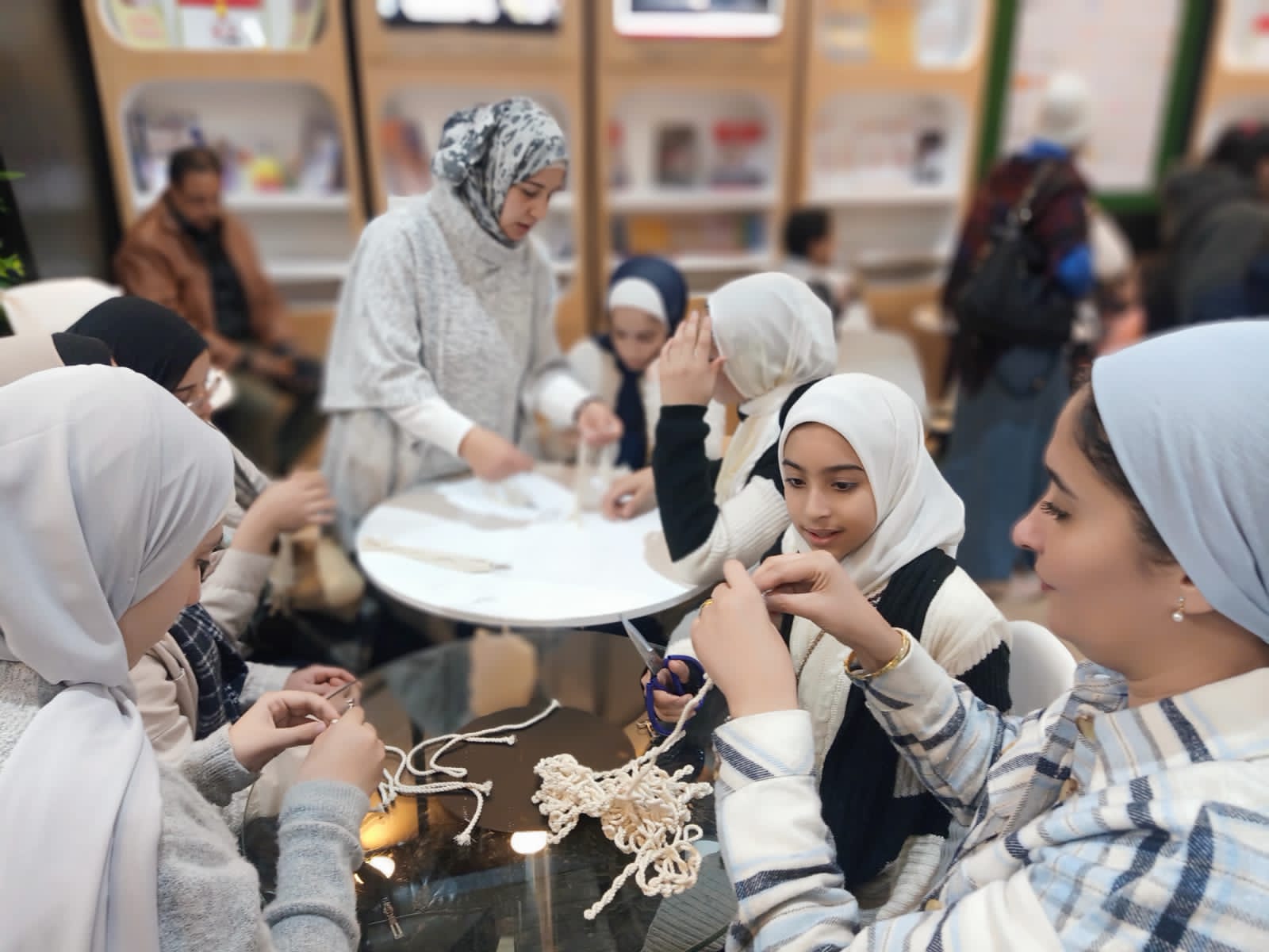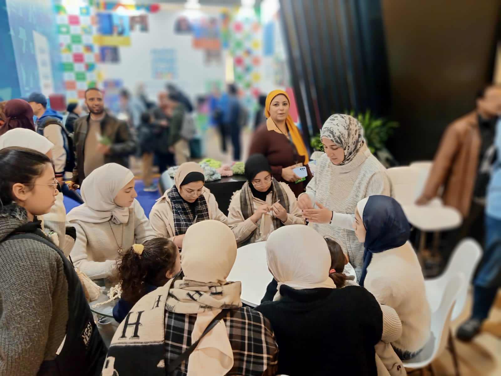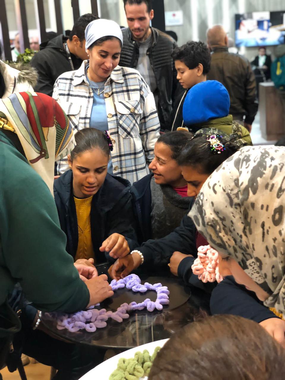 عضوات أندية الفتاة والمرأة يواصلن تدريب رواد معرض الكتاب بالورشة الحرفية