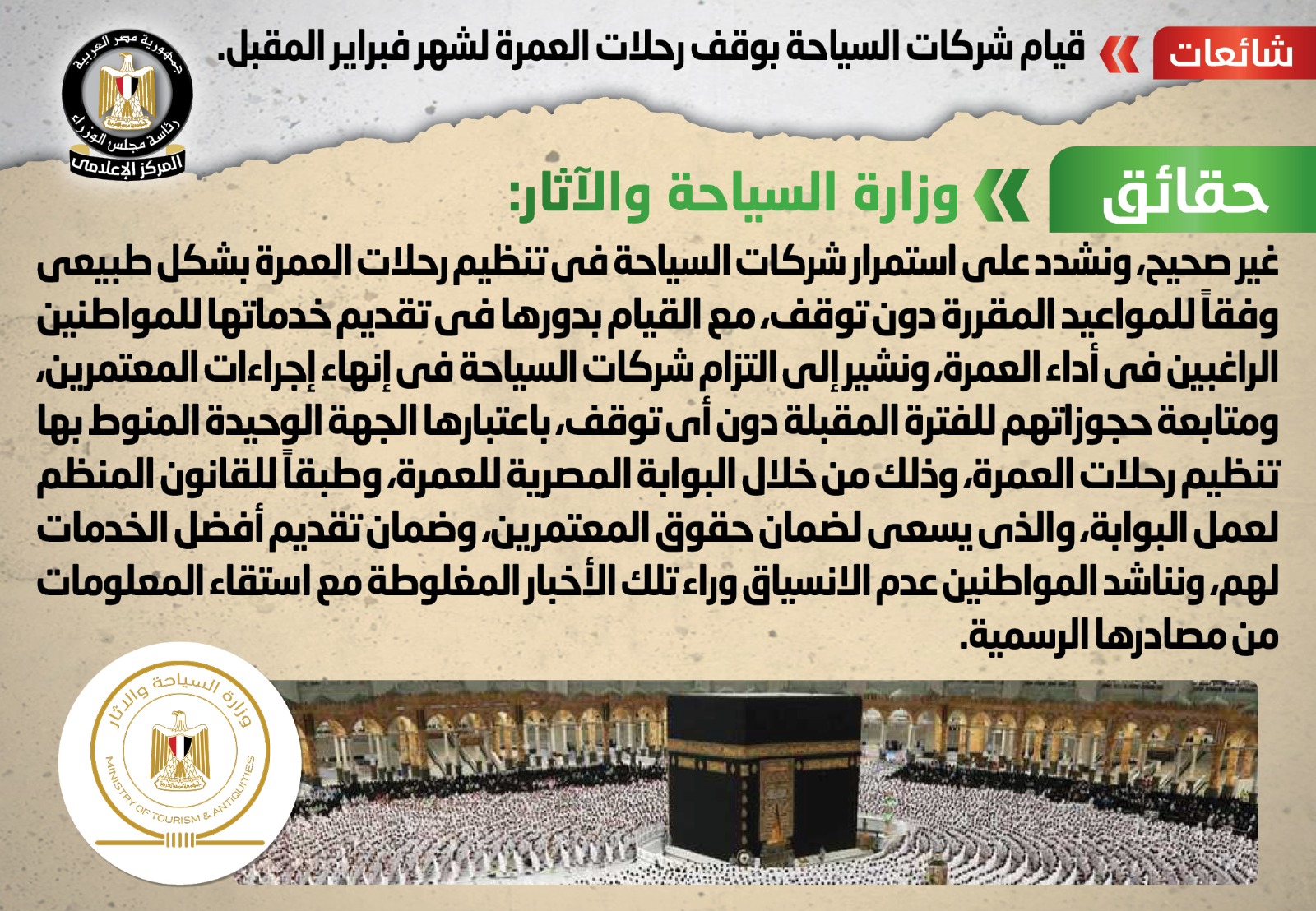 أكد المركز الإعلامي لمجلس الوزراء، ووزارة السياحة والآثار، أنه لا صحة لقيام شركات السياحة بوقف رحلات العمرة لشهر فبراير المقبل، مُشددًا على استمرار شركات السياحة في تنظيم رحلات العمرة بشكل طبيعي وفقًا للمواعيد المقررة دون توقف، مع القيام بدورها في تقديم خدماتها للمواطنين الراغبين في أداء العمرة، مشيرًا إلى التزام شركات السياحة في إنهاء إجراءات المعتمرين، ومتابعة حجوزاتهم للفترة المقبلة دون أي توقف، باعتبارها الجهة الوحيدة المنوط بها تنظيم رحلات العمرة، وذلك من خلال البوابة المصرية للعمرة.