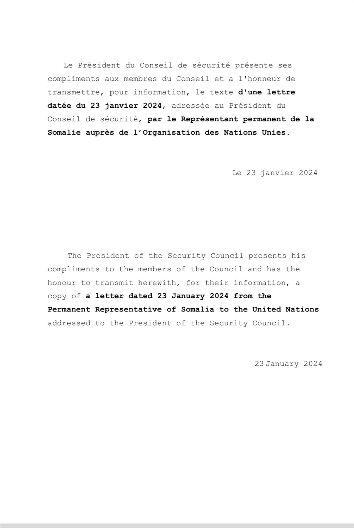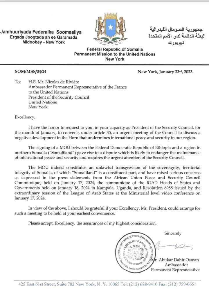 قدمت الحكومة الصومالية طلبًا لمجلس الأمن بعقد جلسة طارئة لمناقشة توقيع مذكرة التفاهم بين صوماليلاند وأثيوبيا، بهدف الوصول للبحر الأحمر، الذى اعتبرته مقديشو انتهاكًا لسيادة الوطن.