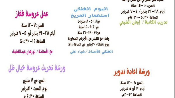وأكد المركز أن أنشطة وبرنامج نصف العام الموجه للأطفال واليافعين و يشمل على عدد من الورش الفنية التي تنمي روح الفنان المبتكر لدى الطفل إلى جانب لقاءات اخرى جنباً إلى جنب مع هذا النوع من النشاط وهي لقاءات علمية من خلال يوم فلكي بالتعاون مع مبادرة الفلك هيلف مصر ومجموعة ورش للأطفال واليافعين عن كوكب المريخ ولقاء للكبار وأولياء الأمور ايضا عن علوم الفضاء والأجرام السماوية و كذلك للأطفال موعد مع التعرف على التراث وتعزيزه من خلال ورشة كيفية تحريك عروسة خيال الظل وتعد هذه الورشة مكملة لبرنامج المركز والذي سبق تقديمه على مراحل سابقة من خلال ورش عروسة خيال الظل التنفيذ والتصميم والتي من خلالها يتعرف الطفل على نشاط تراثي نحافظ عليه من الاندثار ويتعرف على فنونه وتاريخه و باباواته ( فصول عروضه المختلفة)