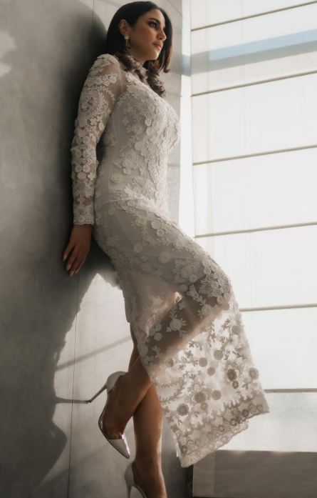 وتألقت درة بإطلالة ساحرة، مميزة للغاية، من أختيار خبير الموضة أحمد أشرف، حيث ارتدت فستان طويل مجسم، بأكمام طويلة، صمم من قماش الدانتيل الناعم باللون الأبيض، الفستان حمل توقيع CAROLINA HERRERA، وعكس قوامها الممشوق ووزنها المثالي، فيما انتعلت صندلًا بكعب عال.