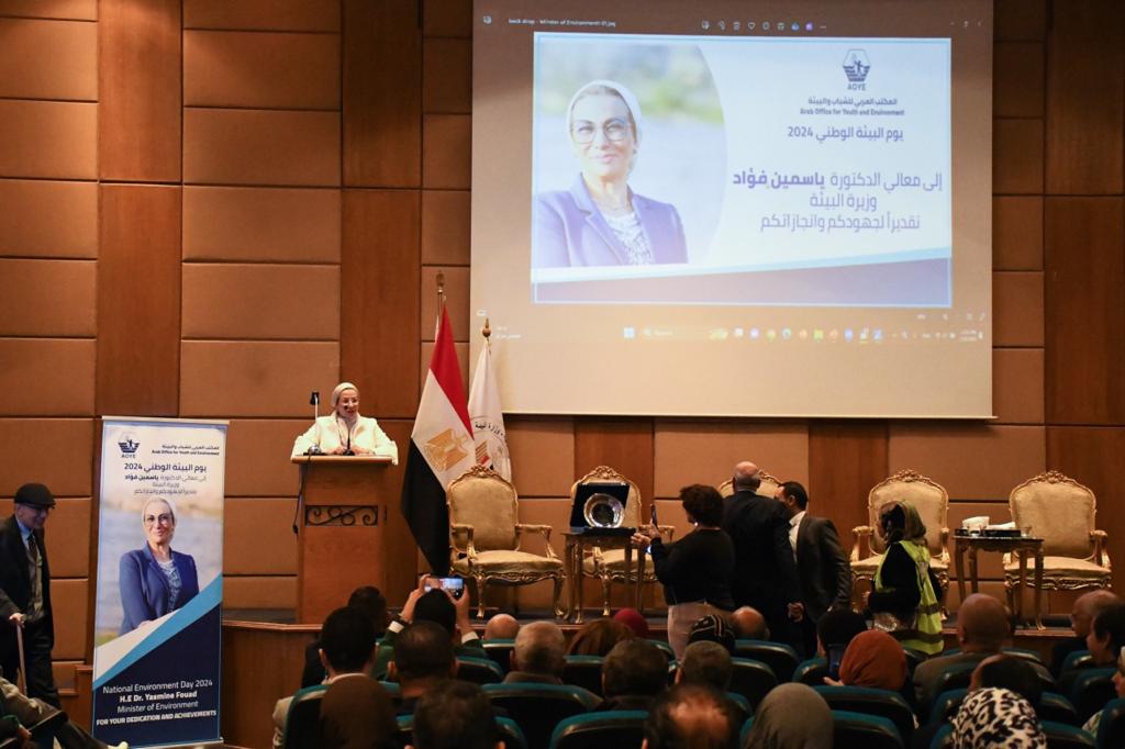وخلال الاحتفالية تم تكريم الدكتورة ياسمين فؤاد من المكتب العربي للشباب والبيئة، والمنتدى المصرى للتنمية المستدامة، والشبكة العربية للبيئة والتنمية، تقديرا لدورها الريادى فى تعزيز قضايا البيئة والاستدامة، وتم خلال الاحتفالية عرض فيلم تسجيلى عن اهم انجازاتها وإسهاماتها البارزة التى تحققت فى ظل قيادتها ،في عصر احتلت فيه قضايا البيئة والتنمية المستدامة مكانة خاصة على رأس أولويات القيادة السياسية بدعم من فخامة الرئيس عبد الفتاح السيسي. رئيس الجمهورية وأيضاً على رأس أولويات الحكومة المصرية ممثلة في دولة رئيس مجلس الوزراء الدكتور مصطفى مدبولي ، فقد نجحت وزيرة البيئة فى أن تجعل مصر محط أنظار العالم حينما نجحت في جذب قمتين أهميتين أحدهما للتنوع البيولوجي "cop14"في عام 2018 ، والآخرى للتغير المناخي " cop27"في عام 2022 بمدينة شرم الشيخ ،والتحضير والإدارة لقمة الأمم المتحدة الثامنة والعشرين لتغير المناخ والتي عقدت بمدينة دبي بدولة الإمارات العربية المتحدة والتي حققت أيضا العديد من النتائج الإيجابية على المستوى العالمي، والنجاح أيضاً اصدار أول قانون لإدارة المخلفات رقم ٢٠٢ لسنة ٢٠٢٠، في سابقة هي الأعظم منذ سنوات عديدة لمواجهة واحدة من أخطر المشكلات البيئية ، وإطلاق الاستراتيجية الوطنية للتغيرات المناخية 2050، وجهود الحفاظ على الموارد الطبيعية، وإرساء مبادئ الإدارة الرشيدة لتلك الموارد، وايضا جهود تعزيز الاستثمار البيئي والمناخي في مصر، وغيرها من الانجازات.