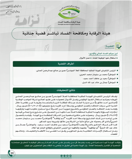 - حصوله على عقود لصالح شركة المواهب الوطنية (المذكور أحد مُلاكها) من مدينة الملك عبدالله للطاقة الذرية والمتجددة بطريقة غير نظامية، خلال الفترة التي سبقت التحاقه بالعمل الحكومي بواسطة أحد أقاربه، بلغ مجموعها (206.630.905) مائتين وستة ملايين وستمائة وثلاثين ألفًا وتسعمائة وخمسة ريالات.