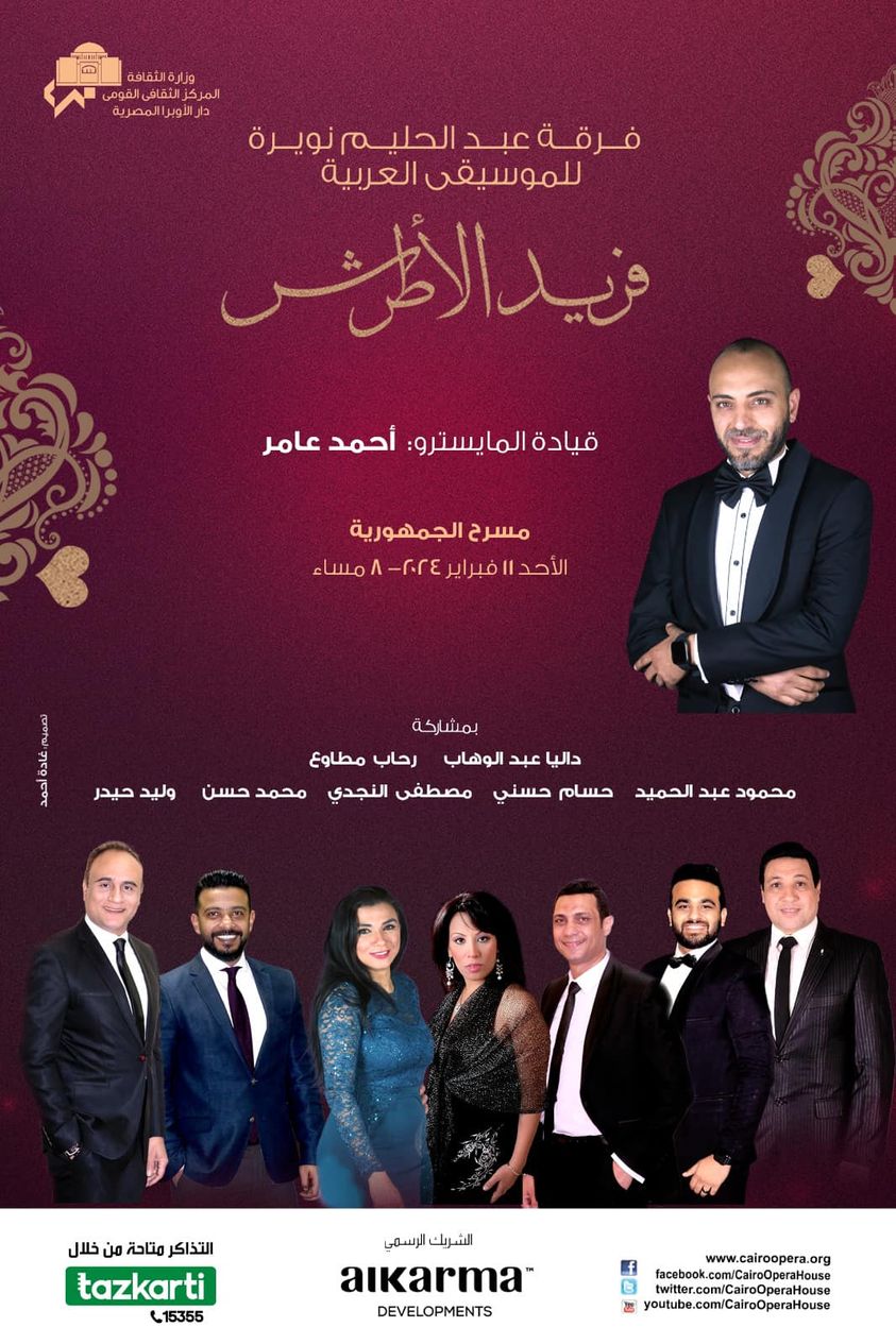 تحيي فرقة عبد الحليم نويرة ليلة غنائية من أعمال الكبير فريد الأطرش، وذلك ضمن سلسلة الحفلات الشتوية التي تقدمها الأوبرا مع أجمال أصواتها .