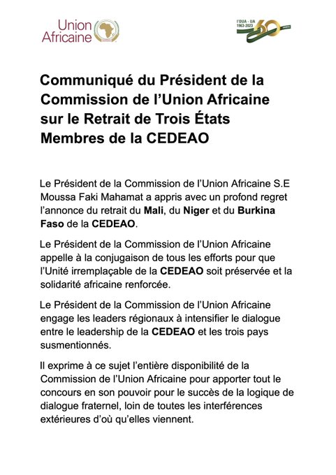 ويحث رئيس مفوضية الاتحاد الأفريقي، القادة الإقليميين على تكثيف الحوار بين قيادة الجماعة الاقتصادية لدول غرب أفريقيا والبلدان الثلاثة المذكورة أعلاه.