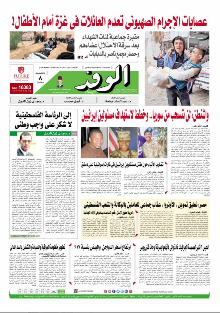 تنشر جريدة الوفد في عددها الصادر، غدًا الأربعاء، العديد من الموضوعات والتقارير الإخبارية المهمة، أبرزها “عصابات الإجرام الصهيوني تعدم العائلات في غزة أمام الأطفال”.