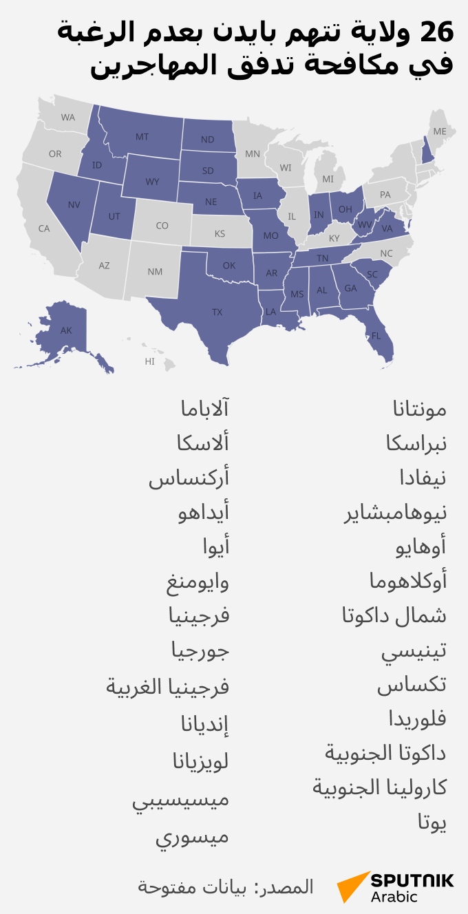أفادت تقارير إخبارية نشرتها وكالة سبوتنيك، بأن حكام ولاية تكساس و25 ولاية أمريكية أخرى اتهموا الرئيس الأمريكي جو بايدن بعدم الرغبة في مكافحة الهجرة غير الشرعية.