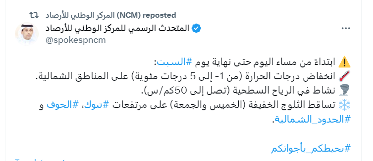 وقال المتحدث الرسمي للمركز الوطني للأرصاد: "ابتداءً من مساء اليوم حتى نهاية يوم السبت، انخفاض درجات الحرارة (من 1- إلى 5 درجات مئوية) على المناطق الشمالية، ونشاط في الرياح السطحية (تصل إلى 50كم/س)، وتساقط الثلوج الخفيفة (الخميس والجمعة) على مرتفعات تبوك، الجوف والحدود الشمالية".