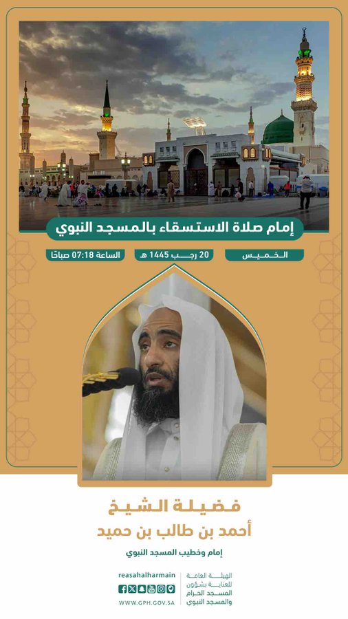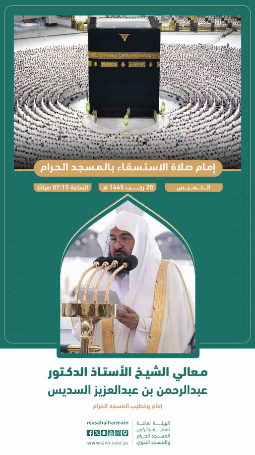 وكانت الصفحة الرسمية للهيئة العامة للعناية بشؤون المسجد الحرام والمسجد النبوي، نشرت موعد صلاة الاستسقاء عبر موقع التواصل الاجتماعي "X" نوينر سابقًا، على أن يكون الشيخ الدكتور عبدالرحمن السديس، رئيس الشؤون الدينية بالمسجد الحرام والمسجد النبوي، وإمام المسجد الحرام، إماما لصلاة الاستسقاء بالمسجد الحرام، في تمام الساعة السابعة و15 دقيقة، بينما يؤم المصلين بالمسجد النبوي، الشيخ أحمد بن طالب بن حميد إمام وخطيب المسجد النبوي.