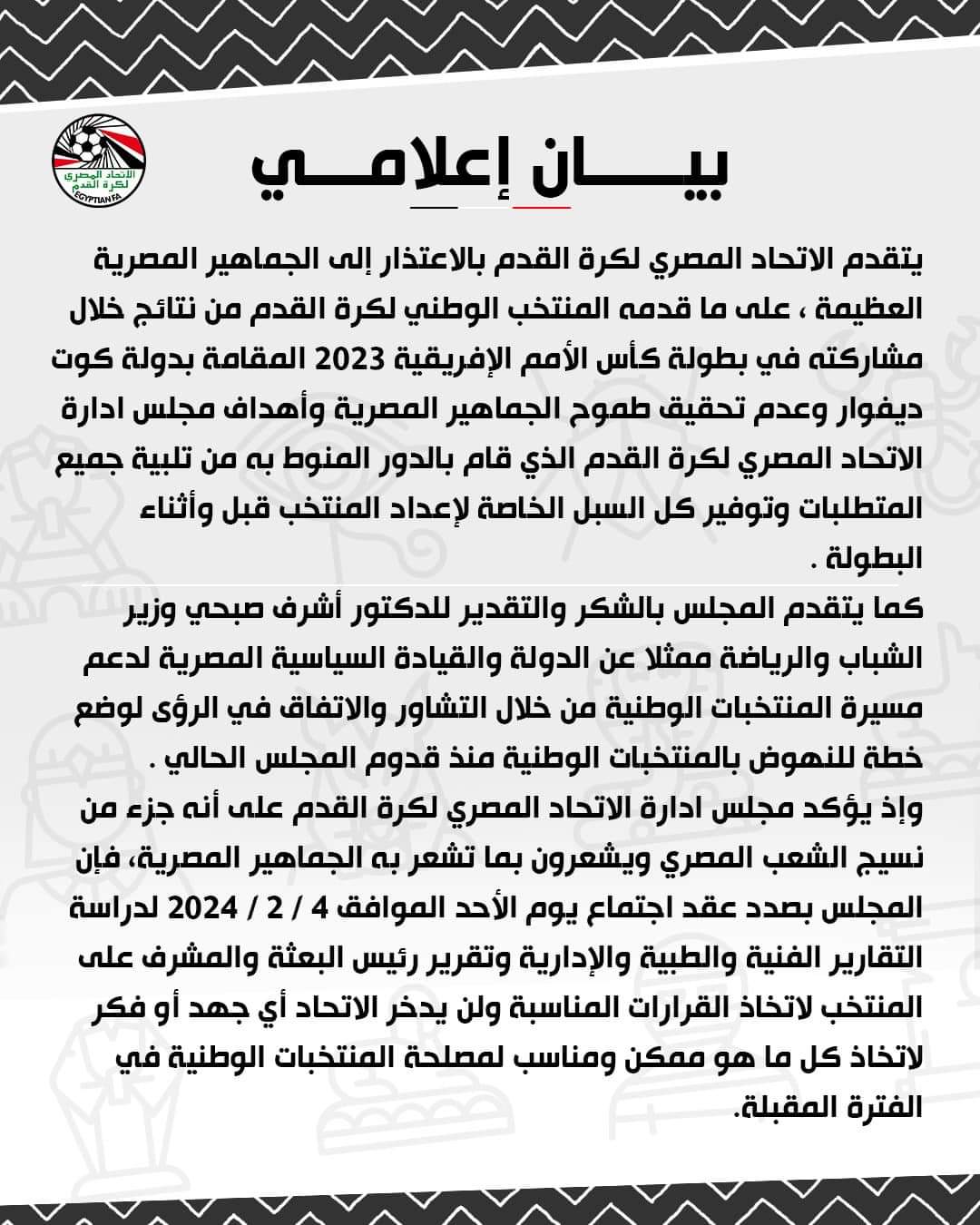 قدم الاتحاد المصري لكرة القدم باعتذار إلى الجماهير المصرية العظيمة، على ما قدمه المنتخب الوطني لكرة القدم من نتائج خلال مشاركته في بطولة كأس الأمم الإفريقية 2023 المقامة بدولة كوت ديفوار وعدم تحقيق طموح الجماهير المصرية وأهداف مجلس إدارة الاتحاد المصري لكرة القدم الذي قام بالدور المنوط به من تلبية جميع المتطلبات وتوفير كل السبل الخاصة لإعداد المنتخب قبل وأثناء البطولة.
