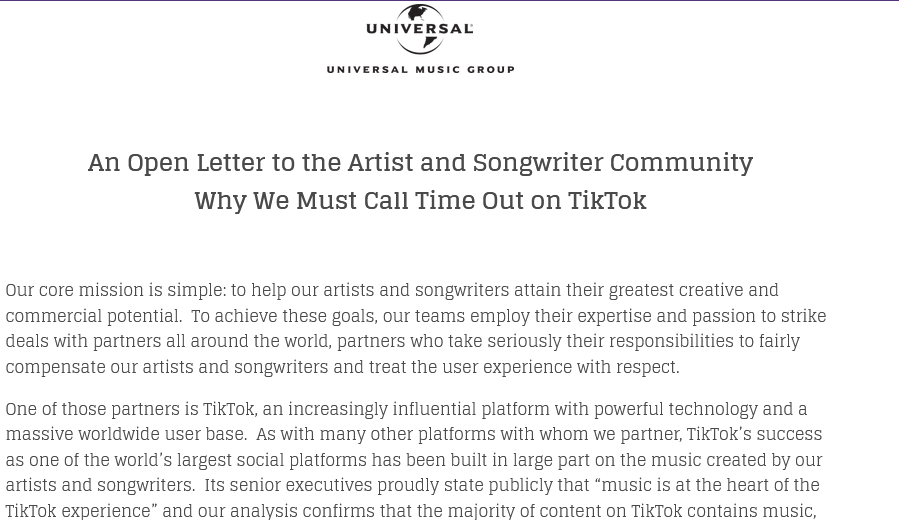 في بيان صادم لها أعلنت شركة Universal Music Group حذف جميع أغاني نجوم الغناء التابعين لها على منصة TikTok، ويتم تطبيق القرار ابتداءً من اليوم 31 يناير 2024، والتي نشرت تفاصيله بالكامل عبر الموقع الرسمي لها.