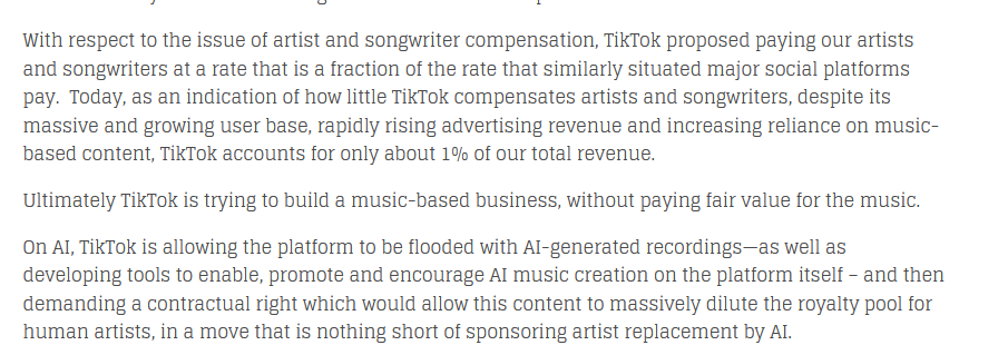 وأضافت "على الرغم من السرد والخطاب الكاذب لشركة Universal، فإن الحقيقة هي أنهم اختاروا الابتعاد عن الدعم القوي لمنصة تضم أكثر من مليار مستخدم تعمل بمثابة وسيلة ترويجية واكتشاف مجانية لمواهبهم."