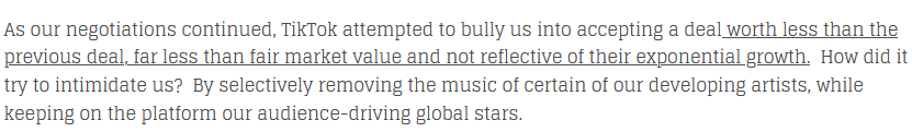 وأضافت: "مع استمرار مفاوضاتنا، حاولت TikTok إجبارنا على قبول صفقة تقل قيمتها عن الصفقة السابقة، وأقل بكثير من القيمة السوقية العادلة ولا تعكس نموها الهائل. كيف حاولت تخويفنا؟ من خلال إزالة موسيقى بعض فنانينا الناشئين بشكل انتقائي، مع الاحتفاظ بنجومنا العالميين الذين يجذبون الجمهور على المنصة".