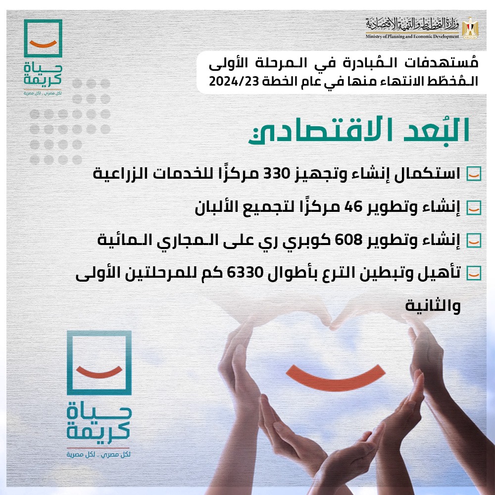 وأشار تقرير وزارة التخطيط والتنمية الاقتصادية إلى مُستهدفات الـمُبادرة في الـمرحلة الأولى الـمُخطّط نهوها في عام الخطة 23/2024 ، ففيما يخص البعد الاجتماعي تستهدف الخطة إنشاء وتطوير وتجهيز 15330 فصلًا ، صيانة 1303 مدرسة، استكمال تطوير 24 مستشفى مركزي، استكمال تطوير وتجهيز 1102 وحدة صحية ، إنشاء وتطوير 367 وحدة إسعاف، استكمال إنشاء 555 عمارة سكنية لـمحدودي الدخل، إلى جانب استكمال إنشاء تطوير وتجهيز 983 مركزًا للشباب ، وفيما يخص البُعد العمراني تستهدف الخطة استكمال توصيل وتطوير شبكات مياه الشرب بأطوال 8.5 ألف كم، استكمال إنشاء وتطوير 323 محطة تنقية مياه الشرب، استكمال شبكات الصرف الصحي لأطوال 21.3 ألف كم، علاوةً على إنشاء وتطوير 1469 مشروع صرف صحي، استكمال 166 محطات مُعالجة الصرف الصحي، استكمال تطوير 166 طريقًا، واستكمال تطوير 116 محطة سكة حديد، استكمال تطوير 57 تجمّعًا حضريًا في نطاق مُبادرة "حياة كريمة"، توصيل شبكات الألياف الضوئية لعدد 1466 قرية ، إنشاء وتطوير عدد 846 مكتب بريد، استكمال مد كابلات وتركيب عدّادات وأعمدة إنارة وأكشاك ومُحوّلات كهربائية لعدد 1464 قرية، توصيل خدمة الغاز الطبيعي لعدد 842 قرية.