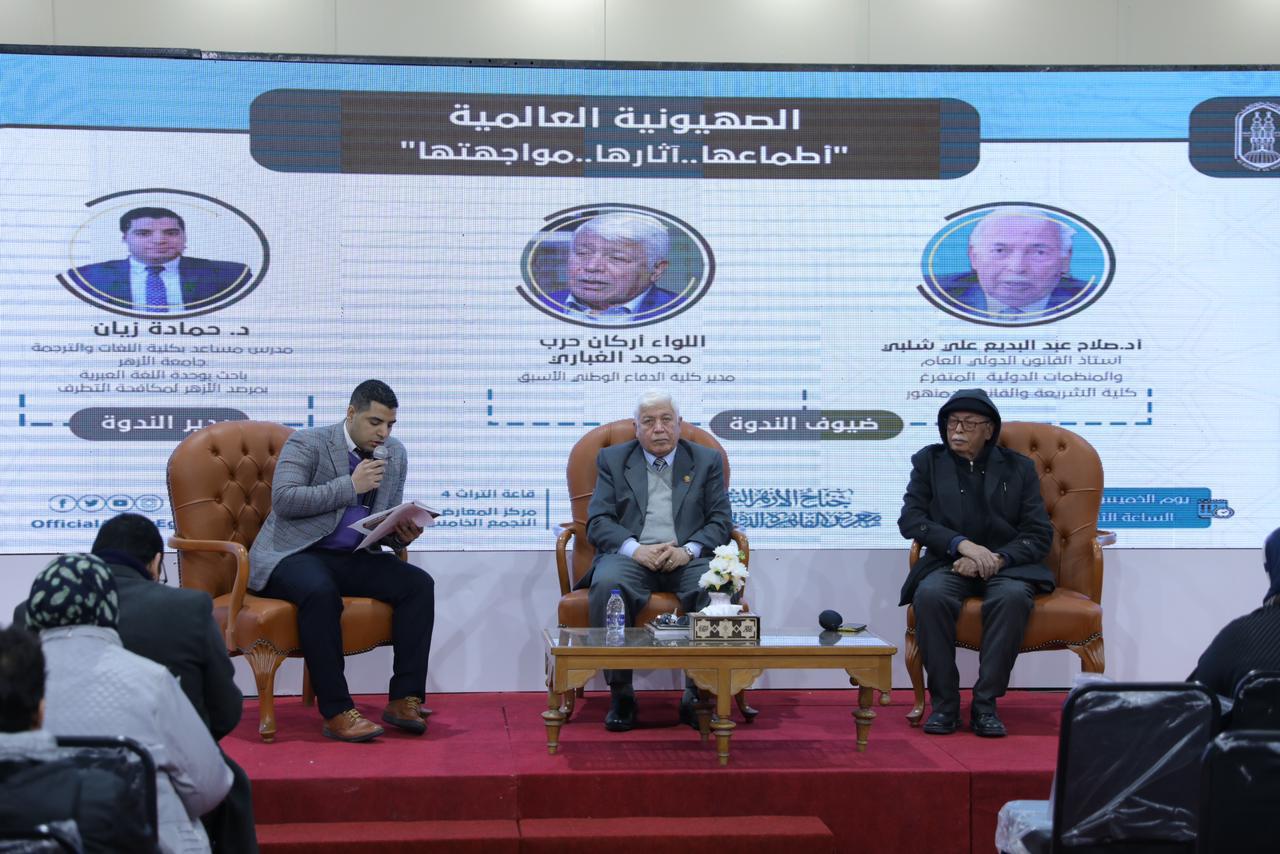 عقد جناح الأزهر الشريف بمعرض القاهرة الدولي للكتاب في دورته 55، اليوم الخميس، ندوة تثقيفية بعنوان "الصهيونية العالمية أطماعها..آثارها.. مواجهتها".