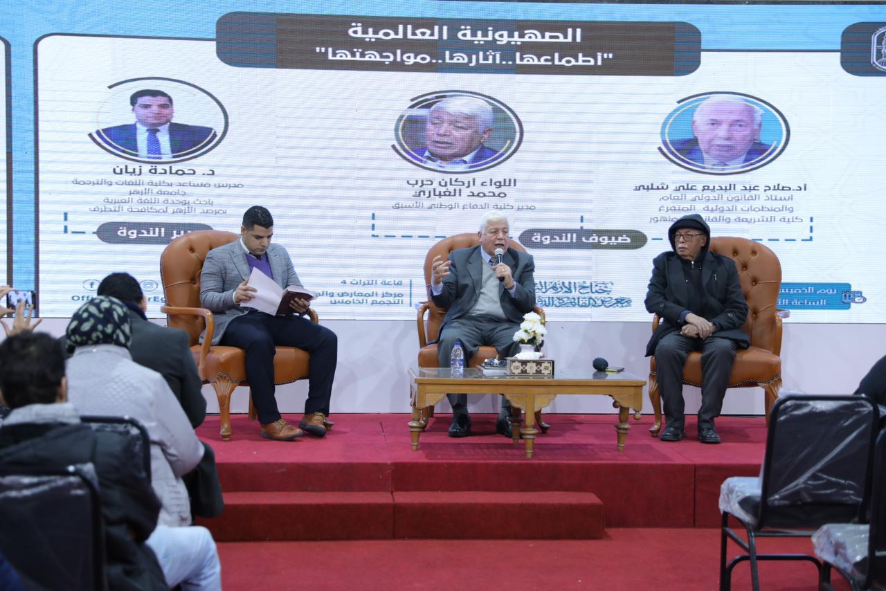 حاضر في الندوة اللواء أركان حرب محمد الغباري، مدير كلية الدفاع الوطني الأسبق بأكاديمية ناصر العسكرية، والدكتور صلاح عبد البديع، أستاذ القانون الدولي العام والمنظمات الدولية المتفرغ - كلية الشريعة والقانون بدمنهور، وأدار الندوة، الدكتور حمادة زيان، مدرس مساعد بكلية اللغات والترجمة، جامعة الأزهر، باحث بوحدة اللغة العبرية بمرصد الأزهر لمكافحة التطرف؛ وناقشت الندوة مخاطر ومفاهيم الصهيونية العالمية وسبل مواجهتها.