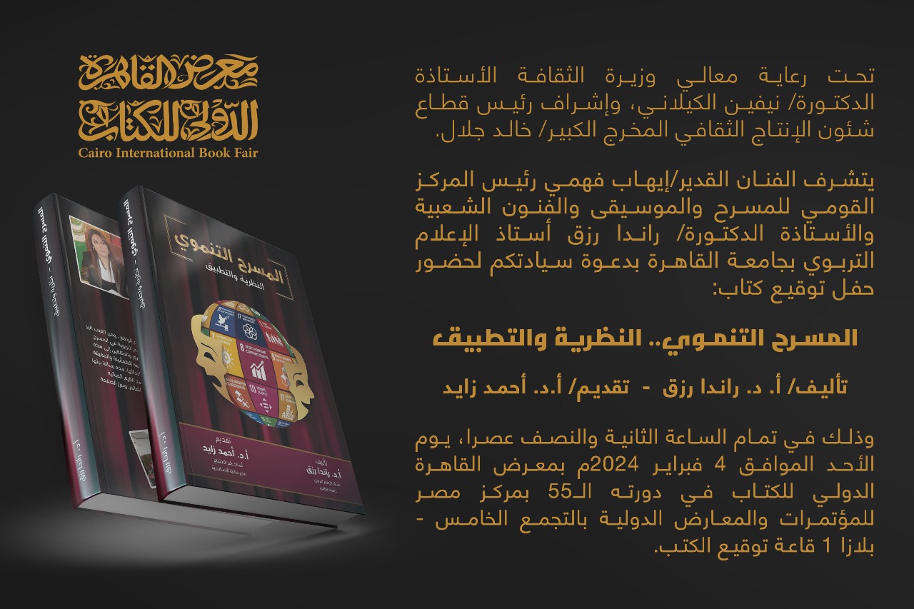 يقيم المركز القومي للمسرح والموسيقى والفنون الشعبية برئاسة الفنان القدير إيهاب فهمي؛ حفل توقيع لأحدث إصدارات المركز "المسرح التنموي .. النظرية والتطبيق" تأليف: أ.د. راندا رزق، تقديم: أ.د. أحمد زايد، تحت رعاية وزيرة الثقافة الدكتورة نيفين الكيلاني، وإشراف رئيس قطاع شئون الإنتاج الثقافي المخرج الكبير خالد جلال.