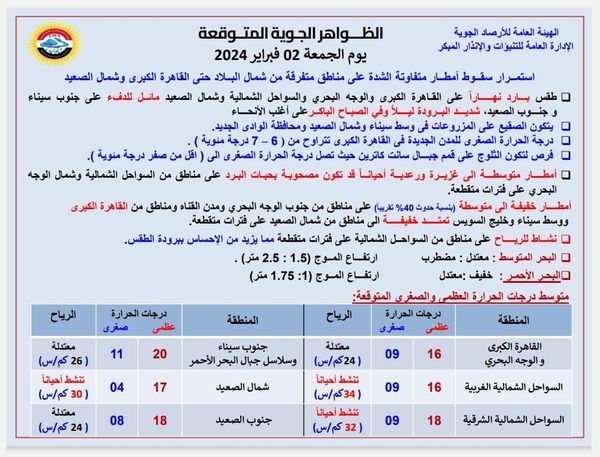 ويسود طقس بارد نهارا على القاهرة الكبرى والوجه البحري والسواحل الشمالية وشمال الصعيد مائل للدفء على جنوب سيناء، وجنوب الصعيد شديد البرودة ليلاً وفي الصباح الباكر على أغلب الأنحاء
