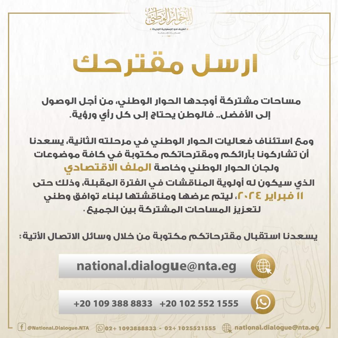 وأضاف مجلس الأمناء من خلال الصفحة الرسمية للحوار على "فيسبوك": مع استئناف فعاليات الحوار الوطني في مرحلته الثانية، يسعدنا أن تشاركونا بآرائكم ومقترحاتكم مكتوبة في كافة موضوعات ولجان الحوار الوطني وخاصة الملف الاقتصادي الذي سيكون له أولوية المناقشات في الفترة المقبلة، وذلك حتى 11 فبراير 2024، ليتم عرضها ومناقشتها لبناء توافق وطني لتعزيز المساحات المشتركة بين الجميع.
