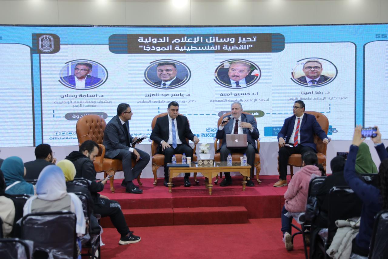 نظم جناح الأزهر الشريف بمعرض القاهرة الدولي للكتاب، اليوم الجمعة ندوة ثقافية تحت عنوان" تحيز وسائل الإعلام الدولية.. القضية الفلسطينية أنموذجًا"، حاضر فيها الدكتور حسين أمين، أستاذ الإعلام بالجامعة الأمريكية، والدكتور ياسر عبد العزيز، الكاتب الصحفي، والدكتور رضا أمين، عميد كلية الإعلام جامعة الأزهر، وأدار الندوة الدكتور أسامة رسلان، مشرف وحدة اللغة الإنجليزية بمرصد الأزهر.