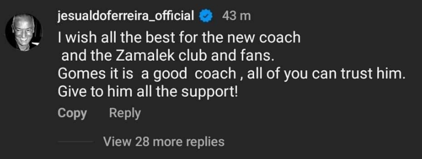 وجه البرتغالي مانويل جوسفالدو فيريرا، المدير الفني السابق للفريق الأول لكرة القدم بنادي الزمالك، رسالة خاصة للمدرب الجديد جوزيه جوميز.