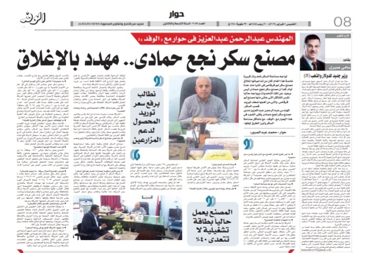 كما أجرت" الوفد" حوارا صحفياً مع مدير "مصنع سكر نجع حمادي" ، بتاريخ ١ فبراير ٢٠٢٤، بعنوان الهندسة عبد الرحمن عبد العزيز مدير مصنع سكر نجع حمادي فى حوار للوفد، <<مصنع سكر نجع حمادي مهدد بالاغلاق>> والذى صرح فيه ان المصنع يواجه خطر الاغلاق بسبب نقص وعزوف المزارعين عن التوريد .