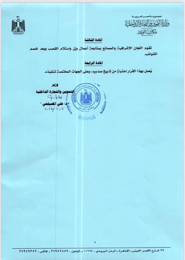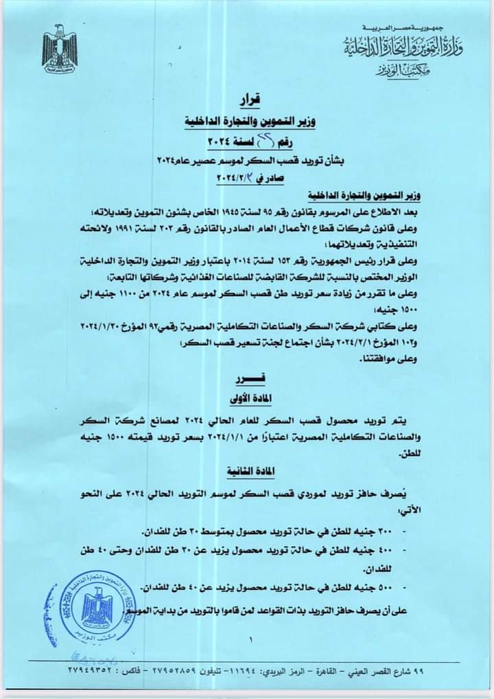 أصدر الدكتور على مصلحى وزير التموين والتجارة الداخلية، اليوم السبت، قرارا بزيادة سعر توريد قصب السكر لهذا الموسم لعام، ٢٠٢٤ إلى ١٥٠٠ جنية لطن القصب، بدلاً من ١١٠٠ جنية للطن، مع صرف حافز توريد اضافى تشجيعى قدرة ٣٠٠ جنية لطن، فى حالة توريد محصول بمتوسط ٣٠ طن من قصب السكر ، ليصبح سعر الطن الواحد ١٨٠٠ جنية، وصرف حافز  ٤٠٠ جنية لطن فى حالة التوريد أكثر من ٣٠ طن وحتى ٤٠ طن من قصب السكر، ليبلغ سعر الطن ١٩٠٠ جنية، كما نص القرار على صرف حافز قدرة ٥٠٠ جنية، فى حالة التوريد لأكثر من ٤٠ طن قصب ليصبح سعر الطن ٢٠٠٠ جنية.