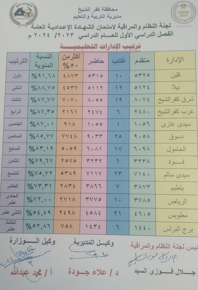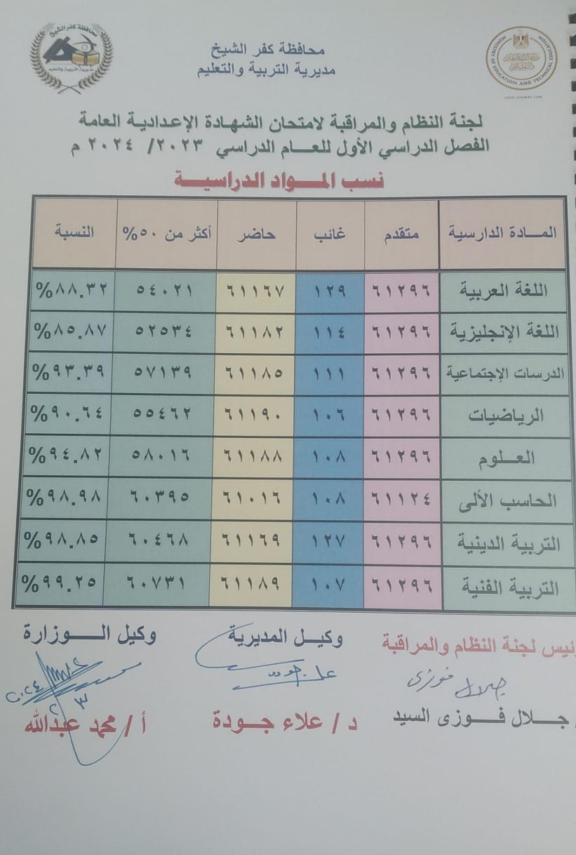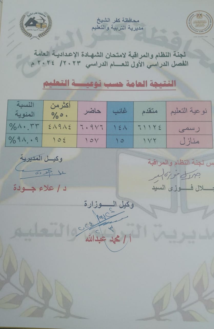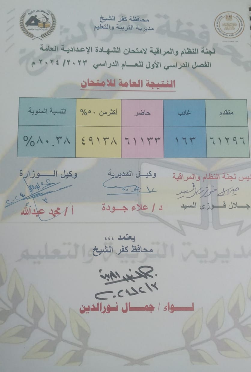اعتماد نتيجة الإعدادية للفصل الدراسي الأول للعام 2023/2024 بكفر الشيخ