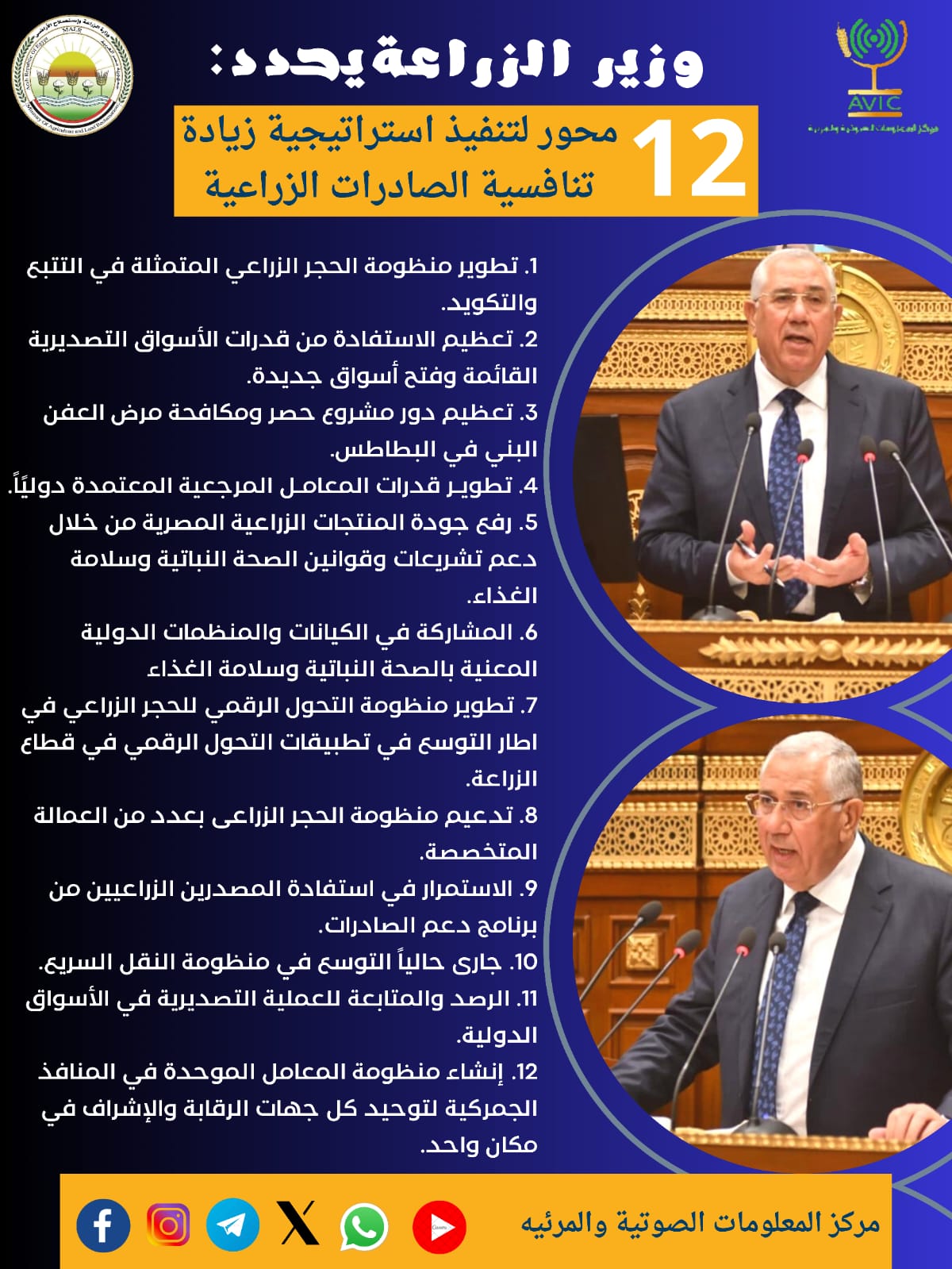 نشر مركز المعلومات الصوتية والمرئية بوزارة الزراعة واستصلاح الأراضي، انفوجرافا، استعرض خلاله المحاور الاثنى عشر التي حدها وزير الزراعة لتنفيذ استراتيجية زيادة تنافسية الصادرات الزراعية، خلال كلمته بالجلسة العامة لمجلس الشيوخ.