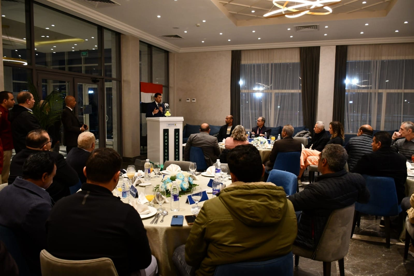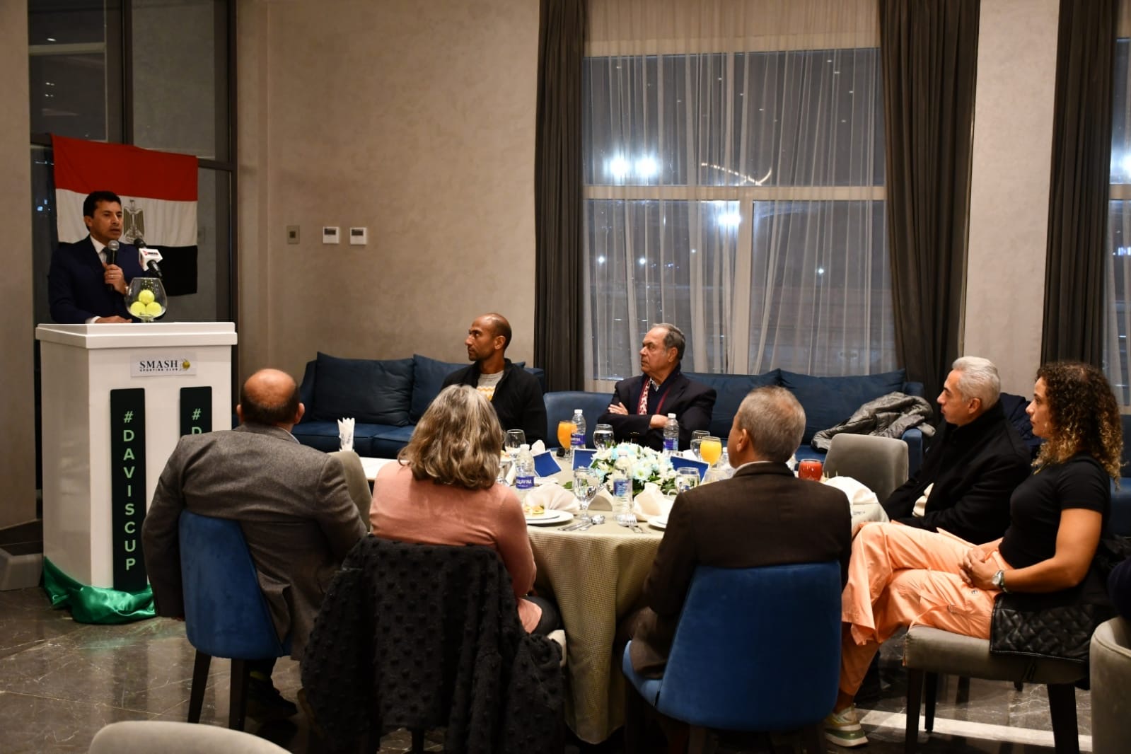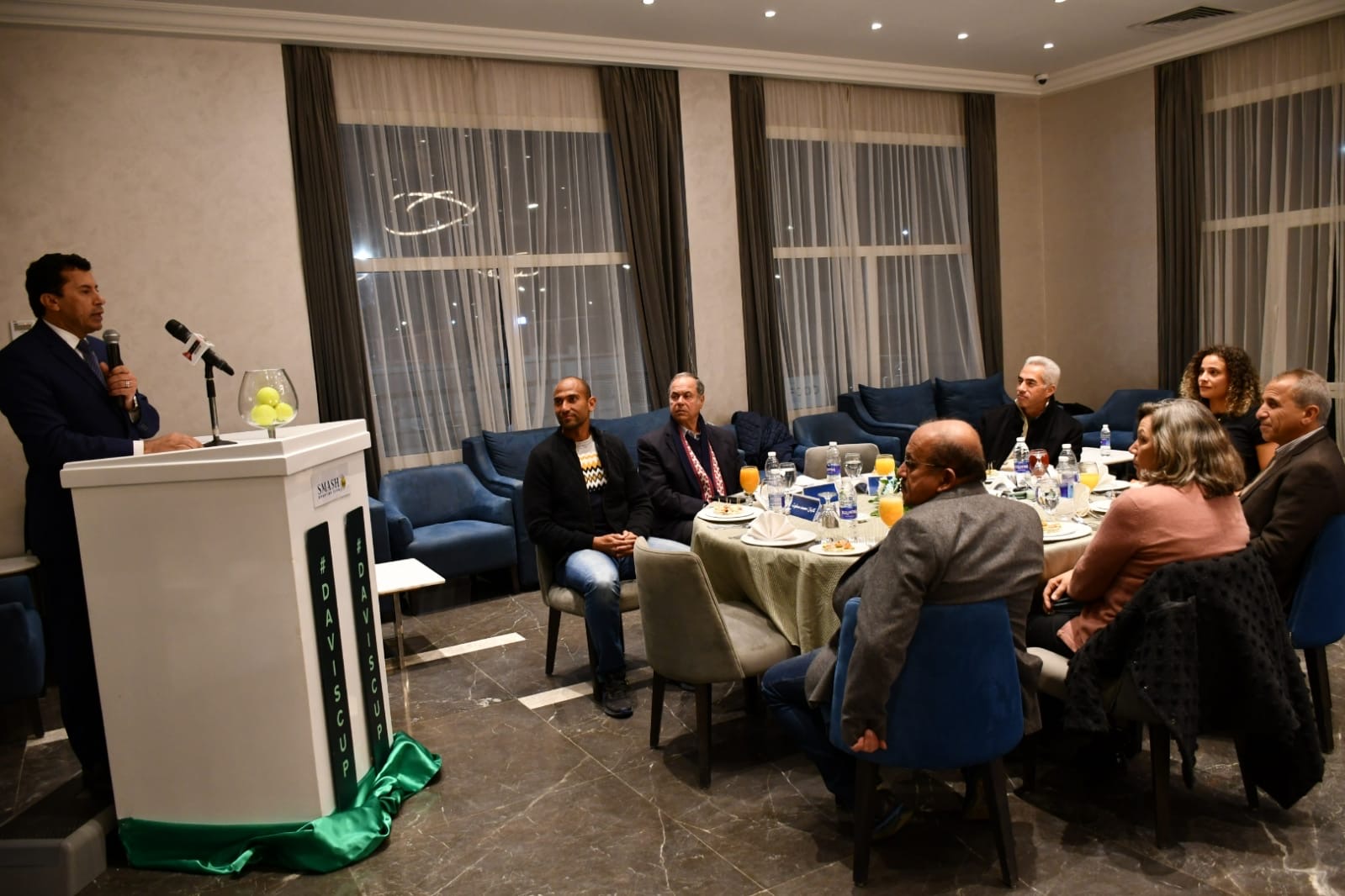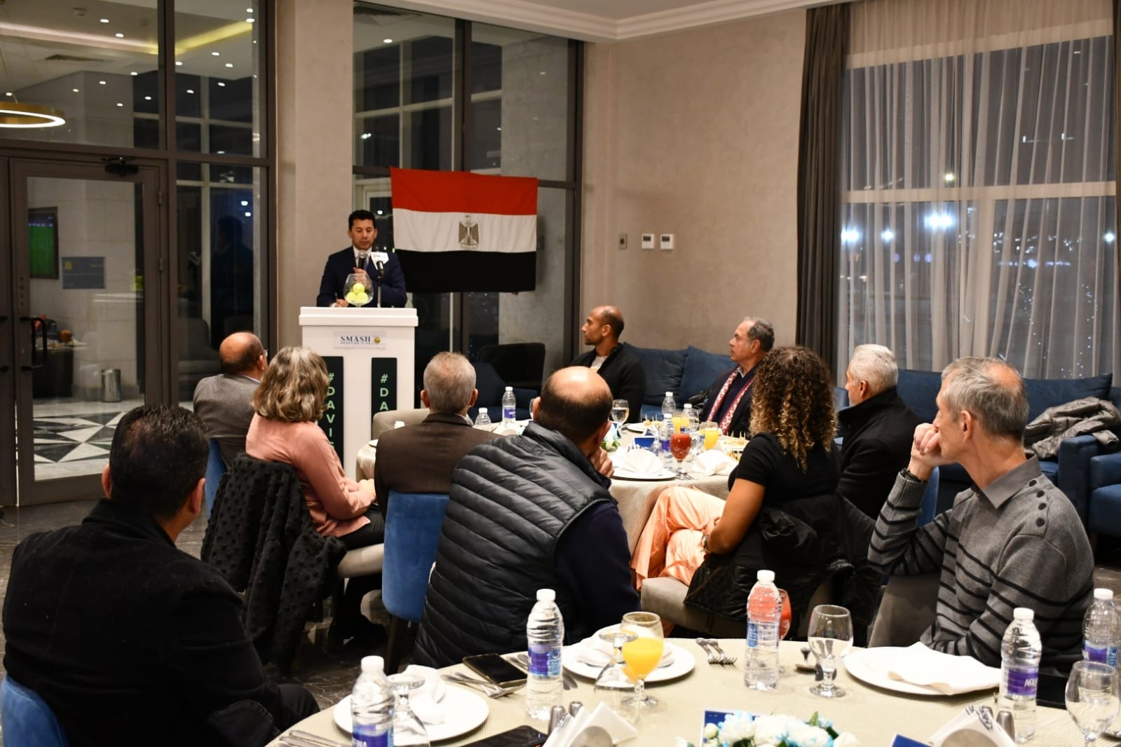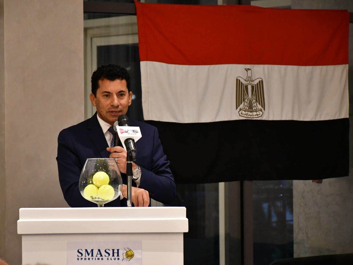 وألقى رئيس اتحاد التنس الكابتن اسماعيل الشافعى كلمة وجه فى بدايتها جزيل الشكر إلى وزير الشباب والرياضة الدكتور أشرف صبحى على دعمه اللامحدود بداية من حرصه على حضور مباريات المنتخب الوطنى ومروراً بتسخير كافة الإمكانات اللازمة لتحقيق المزيد من التطوير لرياضة التنس.