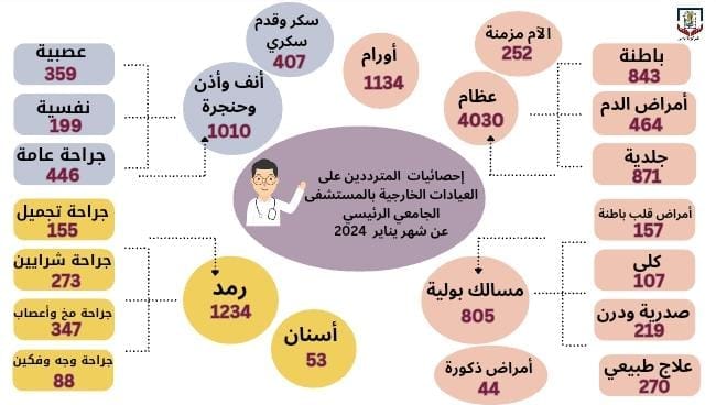 وشهدت المستشفيات زيادة كبيرة في عدد الحالات التي يتم استقبالها في العديد من الأقسام. ففي المستشفى الرئيسي، أعلن عن استقبال 4030 حالة دخول بعيادة العظام، و1134 حالة بعيادة الأورام، و1010 حالة بعيادة الأنف والأذن والحنجرة، إلى جانب تسجيل 1234 حالة بعيادة الرمد، و843 بعيادة الباطنة، و464 حالة بعيادة أمراض الدم، وكما تم تسجيل 871 حالة بعيادة الجلدية، و157 حالة بعيادة أمراض قلب باطنة، و107 بعيادة الكلى، و219 حالة بعيادة صدرية ودرن، وكما بلغ العدد 270 حالة بعيادة العلاج الطبيعي، و805 حالة بعيادة المسالك البولية، و359 حالة بعيادة العصبية، و199 حالة بعيادة النفسية خلال الشهر نفسه.