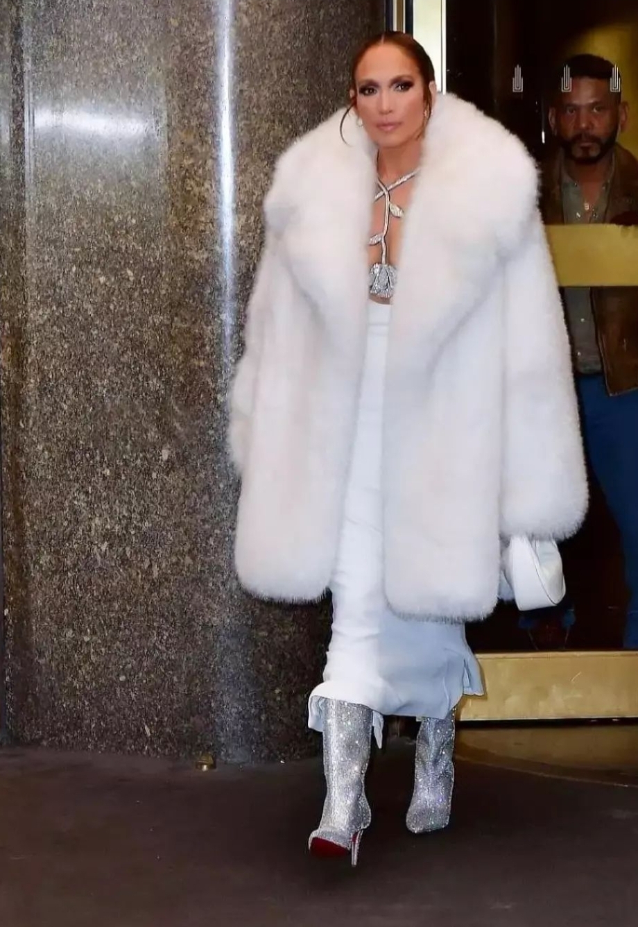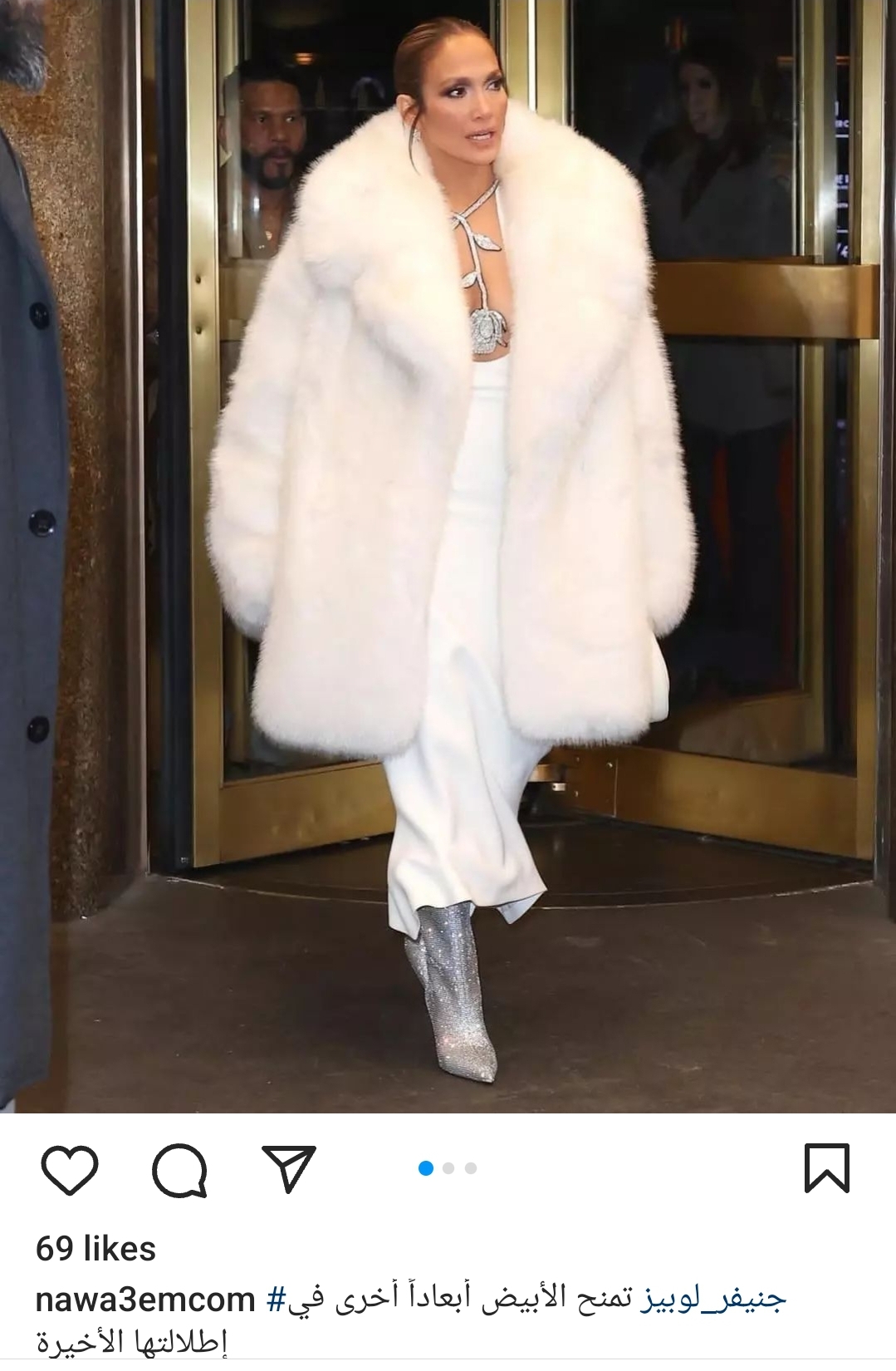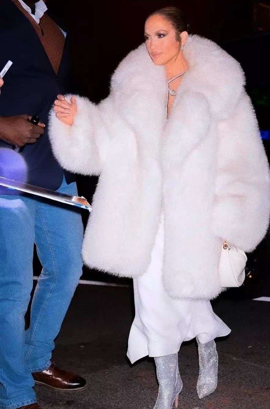 وبدت جينفر بإطلالة شتوية مثيرة كشفت عن أنوثتها على طريقتها الخاصة لكي لا تتعرض الانتقادات اللذعة مثلما فعلت رانيا يوسف بإطلالاتها الجريئة في الكثير من المهرجانات الفنية، حيث ارتدت فستان طويل ومجسم ومثير مكشوف من ناحية الصدر بشكل لافت باللون الأبيض ونسقت عليه بالطو فرو باللون الروز، فيما انتعلت هاف بوت مرصع بحبات الكريستال بالكامل.