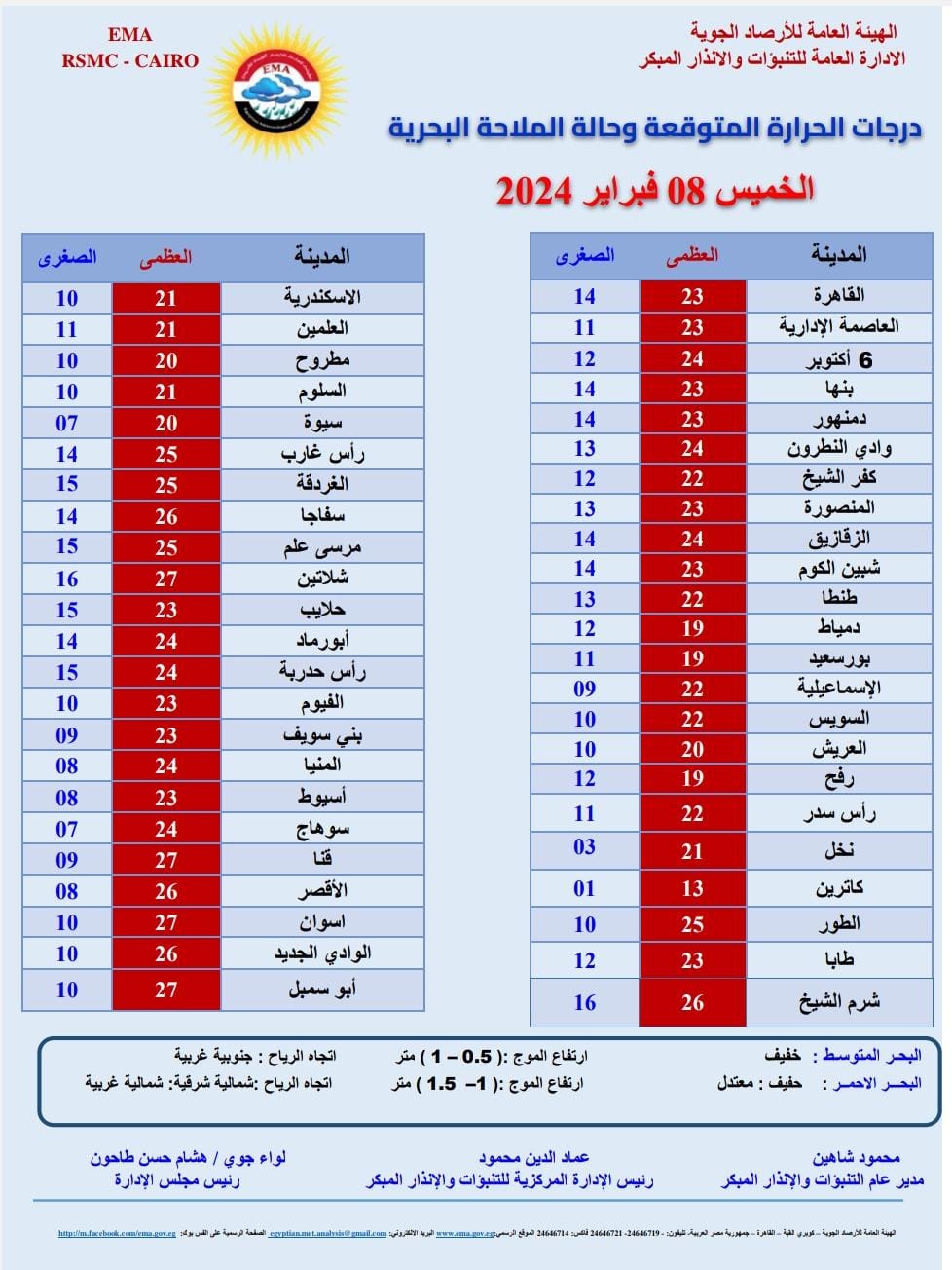 وكشفت هيئة الأرصاد الجوية، توقعات حالة الطقس غداً الخميس، حيث يسود طقس دافئ نهاراً على القاهرة الكبري والوجه البحري وجنوب سيناء وجنوب البلاد، مائل للدفء على السواحل الشمالية.