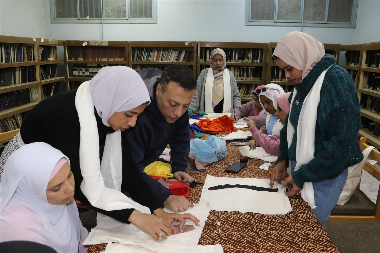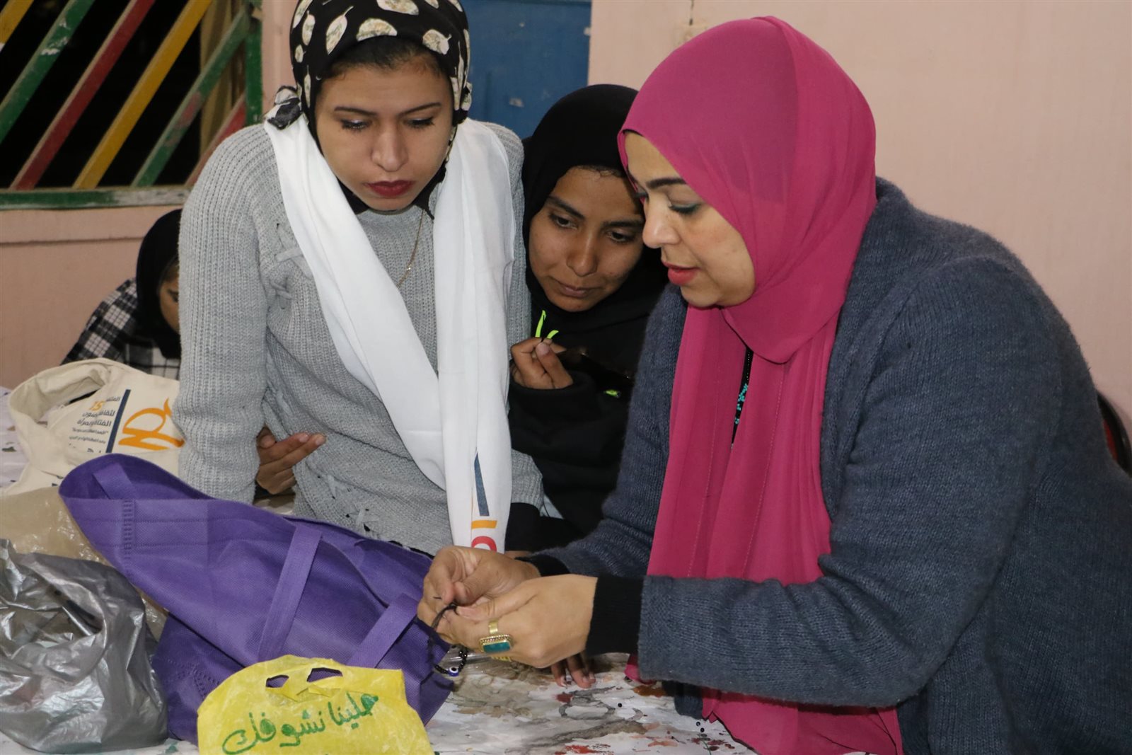 وشرح المدرب عماد عاشور ضمن ورشة "الخيامية" كيفية اختيار القماش الدكة واختيار الرسم وتطريزه على القماش لإنتاج الشنط والمعلقات والمفارش، كما قامت المدربة نحمده رياض في ورشة "إعادة التدوير بمخلفات النخيل" بتنفيذ الشنط والقبعات والأطباق باستخدام جريد النخيل والخوص، وتعشيقها بعدد من الإكسسوارات.
