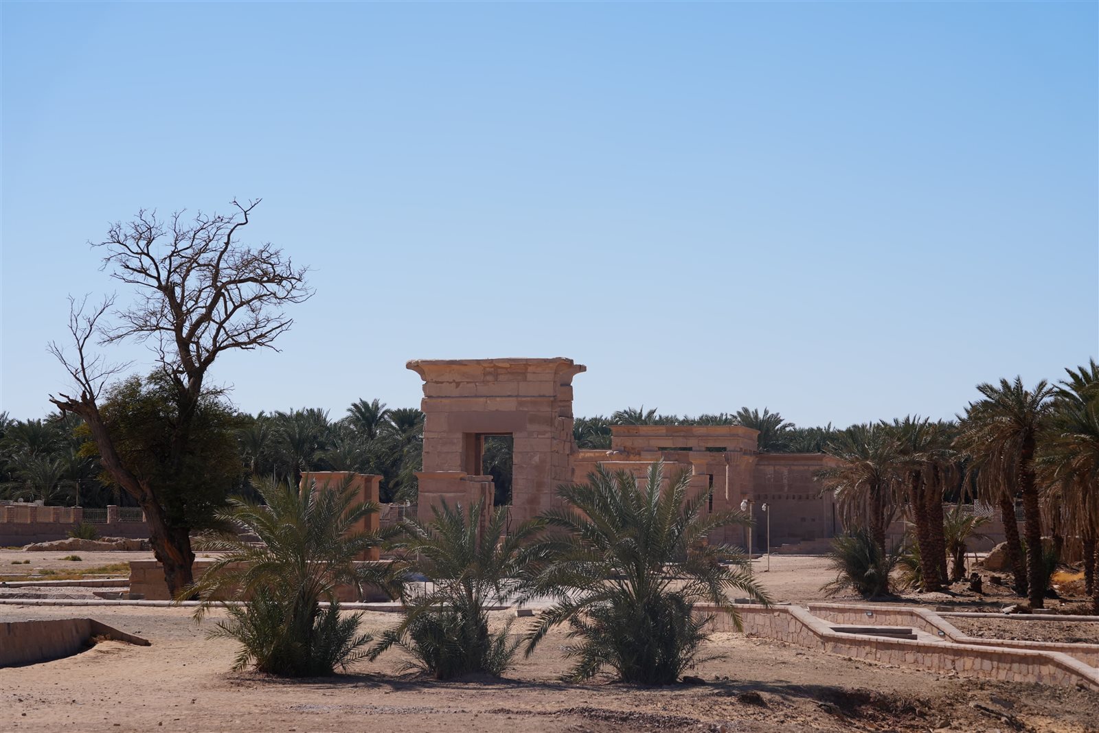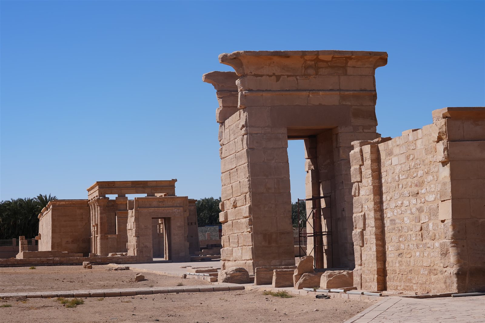 وقال مدير ترميم الآثار بالخارجة إن البوابة الرومانية يليها طريق للكباش على الجانبين، عبارة صفين من التماثيل من الحجر الرملى بجسم أسد ورأس كبش يرجع تاريخه للعصر البطلمى، ثم تأتى البوابة البطلمية التى ترجع إلى عهد بطليموس الثانى وتبلغ 11 مترًا، ويزين أعلى الواجهة الشرقية لها قرص الشمس المجنح والمحاط بحيتى الكوبرا، كما يحوى الجدار الجنوبى الداخلى للبوابة منظرًا يصور الملك بطليموس الثانى يقدم القرابين لمجموعة من المعبودات المختلفة، منها آمون والمعبودة موت والمعبود خنسو والمعبود أتوم والمعبود شو والمعبودة تف موت.