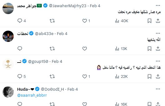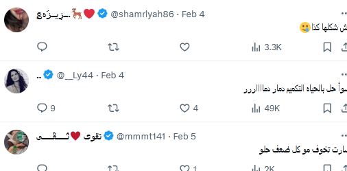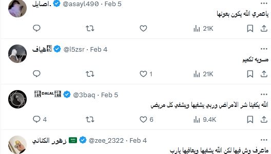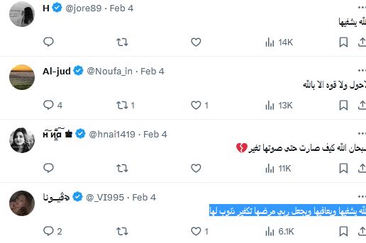 كما ساندها الكثير من المتابعين بتعليقات أيجابية، متمنيين لها الصحة والعافية، قائلين:" الله يرد لها عافيتها يااارب"،ايش فيها ؟ واضح انها تعبانه الله يشفيها ويمدها بالصحه والعافيه".