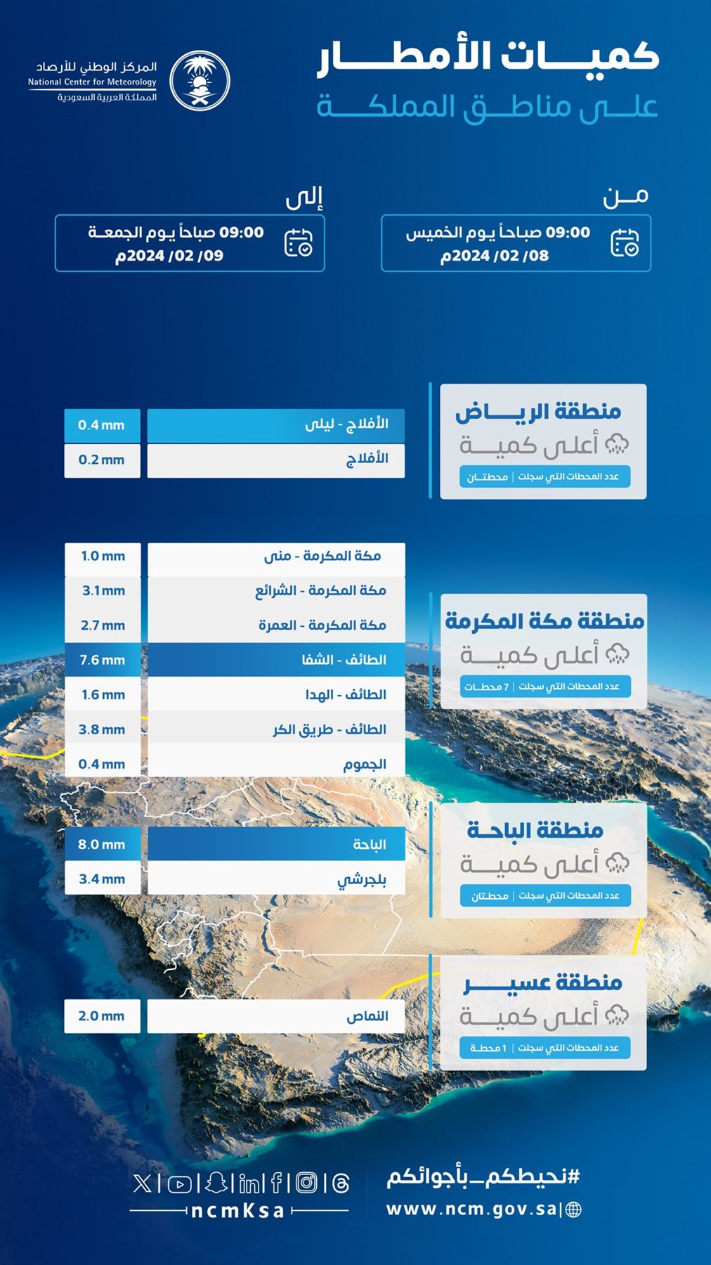 وكان المركز الوطني للأرصاد أعلن في تقريره عن حالة الطقس اليوم الجمعة الموافق 28 رجب 1445ه/9 فبراير 2024م، توقعاته باستمرار هطول أمطار رعدية متوسطة إلى غزيرة تؤدي إلى جريان السيول مصحوبة برياح نشطة وزخات من البرد على أجزاء من مناطق جازان، عسير، الباحة ومكة المكرمة.