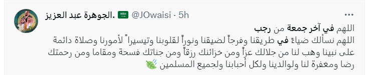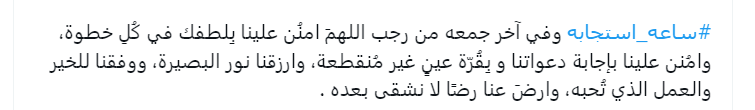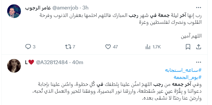 ومن بين التغريدات المتداولة عبر موقع التواصل الاجتماعي “اكس” تويتر سابقًا:"يا رب إنها آخر ليلة جمعة في شهر رجب المبارك فاللهم اختمها بغفران الذنوب وفرحة القلوب، ونصرك لفلسطين وغزة"، و"اللهم انصر أهل فلسطين وهون عليهم واحمي أهل غزة من الطغاة"، و"لعلها ساعة استجابة..وفي آخر جمعة من رجب اللهمَ أمنُن علينا بِلطفك في كُلِ خطوة، وامُنن علينا بإجابة دعواتنا و بِقُرّة عينٍ غير مُنقطعة، وارزقنا نور البصيرة، ووفقنا للخير والعمل الذي تُحبه، وارضَ عنا رضًا لا نشقى بعده".