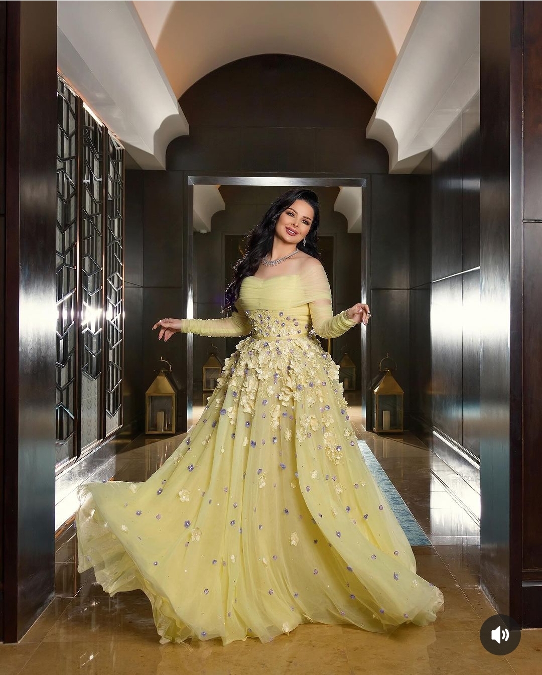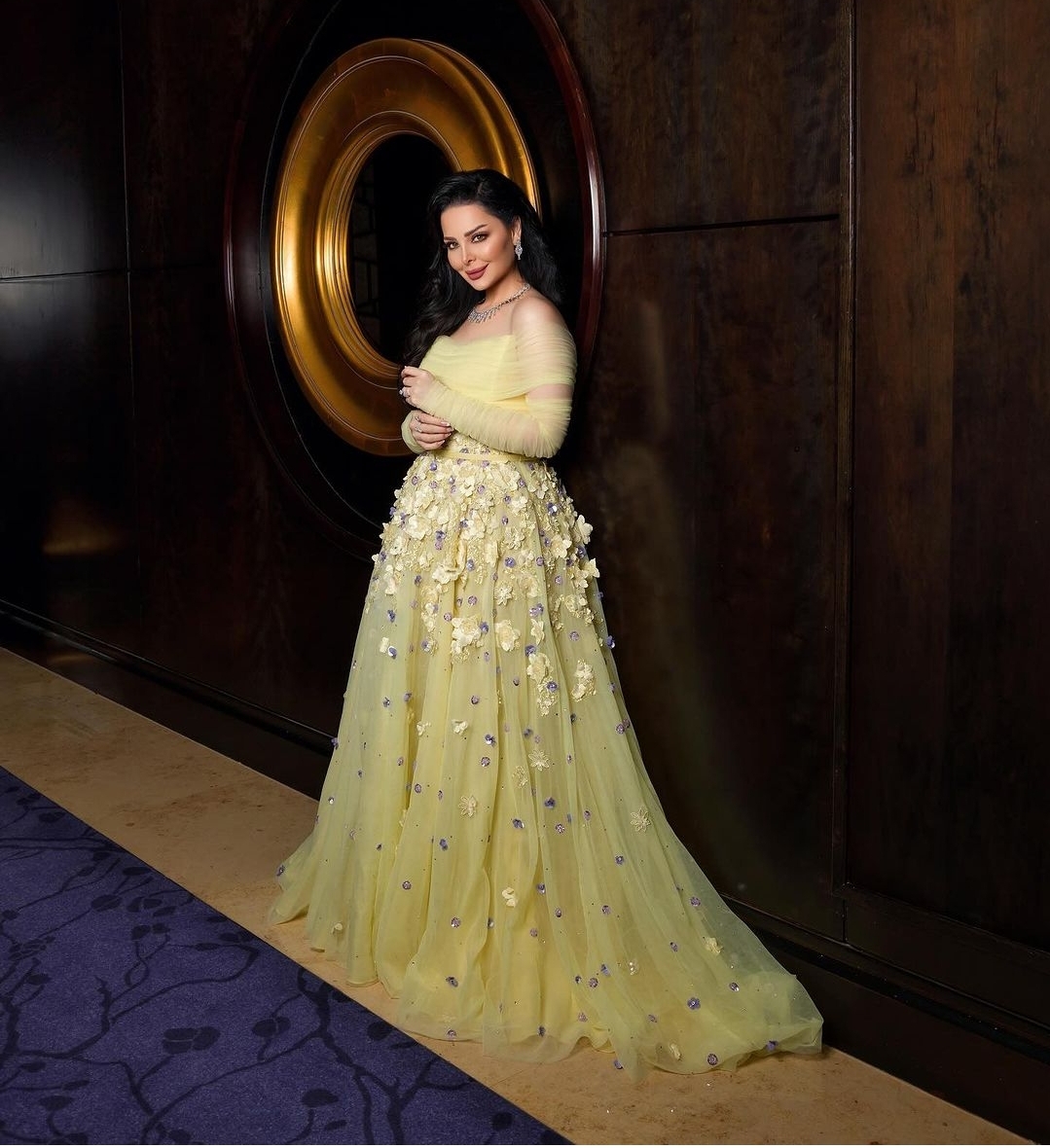 وتألقت ديانا كرزون بإطلالة وردية مبهجة، حيث ارتدت فستان طويل مجسم من أعلى و منفوشا من أسفل، ينتمي لقصة الأوف شولدر، صمم الفستان من قماش التل الناعم باللون الأصفر الكناري وتزين بالزهور الملونه الطائرة لتبدو في غاية جمالها.