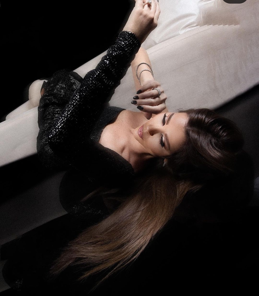 وبدت كارلا حداد بإطلالة سوداء غامضة بلمسه اللامع، حيث ارتدت فستان طويل مجسم، ينتمي لقصة الكب، صمم من قماش الترتر الأسود اللامع، وزينت معه كم طويل، عكس الفستان قوامها الممشوق ووزنها المثالي بشكل ناعم وجذاب.